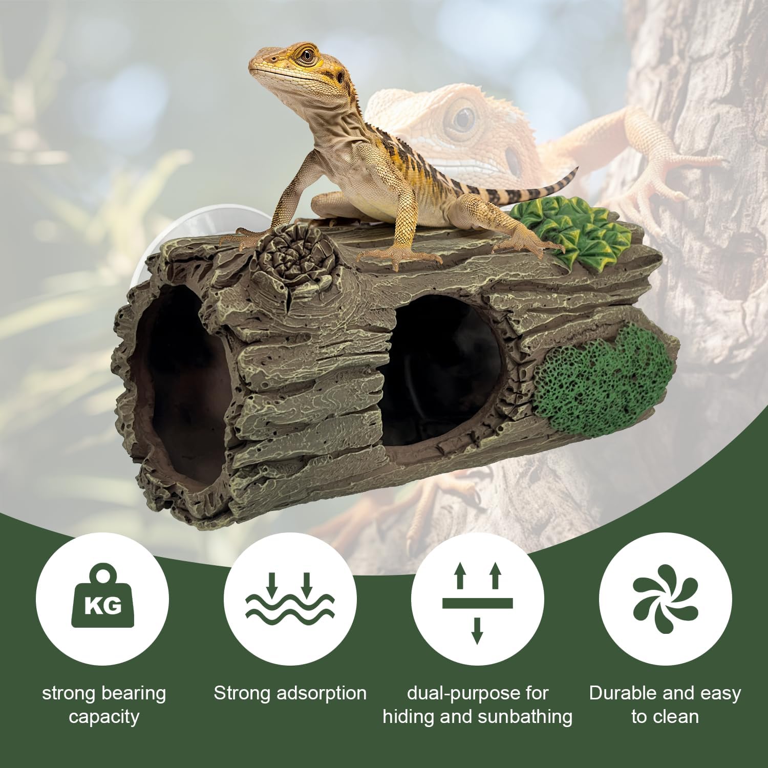Crafted from safe resin with a smoothed interior free of sharp edges, this realistic tree hole hideout (6.5×3.74×3.54 inches) features suction cups and a natural wood-like texture. It provides a secure shelter for reptiles and amphibians—such as geckos, frogs, snakes, and hermit crabs—to reduce stress, support molting, and encourage natural behaviors in both terrestrial and aquatic habitats. Easy to clean and designed for durability.