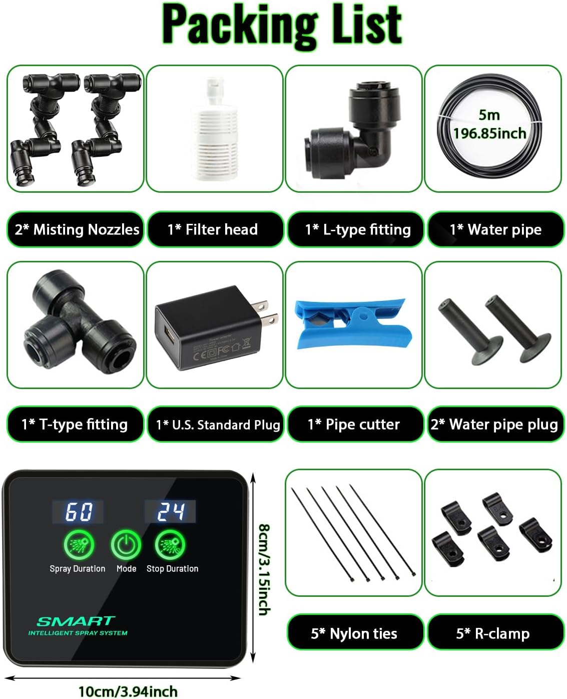 - Included Components: Core Components 1* SMART Misting System Mainframe 1* U.S. Standard Plug 5V2A 2* 360°Adjustable Misting Nozzles 1* Water pipe 5m, 1/4'' diameter 1* T-type water pipe fitting 1* L-type water pipe fitting 1* Filter head 2* Water pipe plugSee more