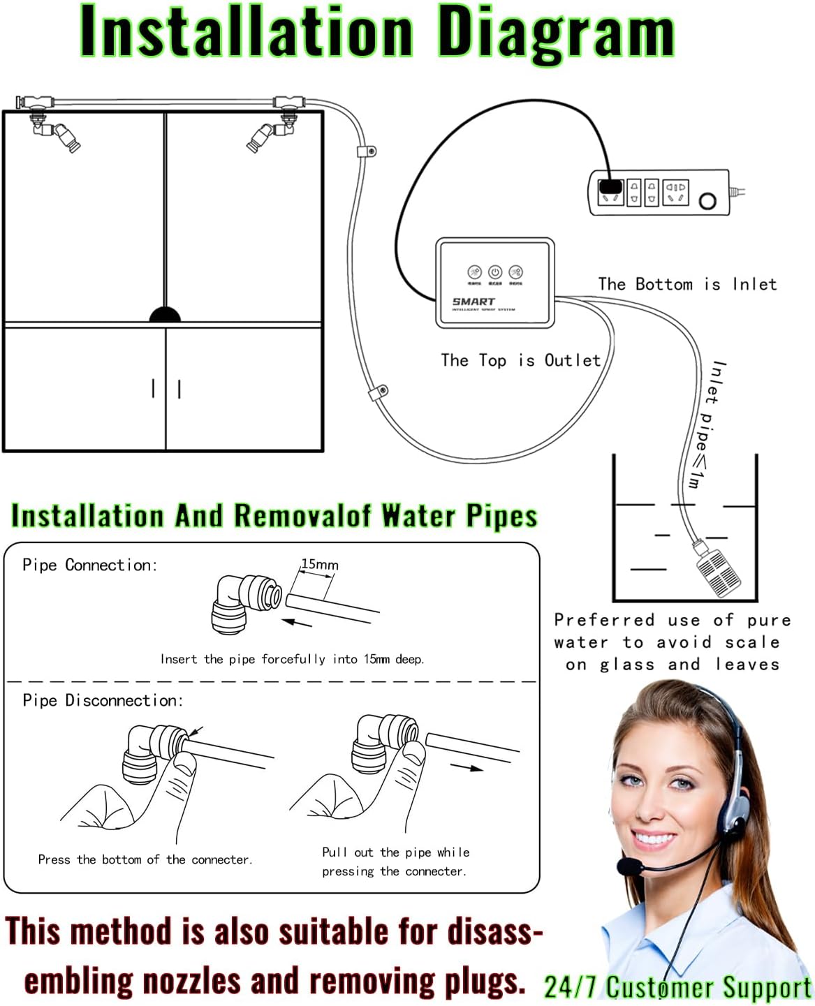 - Care Instructions: ① It is recommended to use pure water to avoid clogging the nozzle and prevent Terrariums from leaving water stains, ② Water pipe and reptile mister host, water pipe fittings, nozzle connection should be tight to prevent leakage, ③ misting system When installing and removing the water pipe at the water inlet and outlet of the main unit, pull out and push it while rotating.