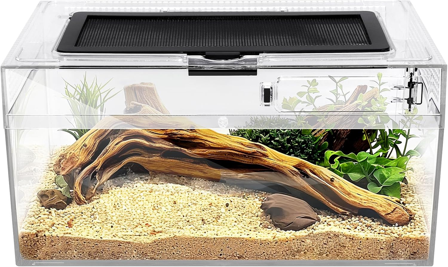 About this item UNIQUE UNBREAKABLE MATERIAL: Different from the glass and arylic, this tank made of high quality PC materials for sturdy and safe, this terrarium tank is suitable for normal reptile amphibian pets as lizard, crested gecko, frog, snake, tortoise and more CONVENIENT TOP LID: The terrarium top lid can openable, you can easily open it with one hand. It's convenience to clean or decoration the tank, no need to assemble it, you can use it when you receive it, we provide two size option: small single 11.8*5.9*7 inch, Large tank with kits19.2*9.4*7.87 inch 360° FULL VIEWING EXPERIENCE: Made of high-transparency PC material, this vivarium tank ensures a panoramic view of your reptile's world. Enhance your observation with an enclosure that brings the captivating reptilian habitat closer to you OUTSTANDING DESIGN DETAILS: The PC terrarium adopts a one-piece design, with no need to assemble, waterproof bottom makes this tank can be used both as a desert terrarium and a rainforest tank, the feeding cover at the top, easy to feed your pet and prevent esca WIDE APPLICATION: Suitable for ecological rainforest terrariums, amphibious animal, breeding lizards, tortoise, chameleon, snake, milk frog, clown frog, jumping spider, turtle, grandis, morelia viridis, snake, gecko, bearded dragon, ball python, leopard, king snake, anole, hermit crabs › See more product details