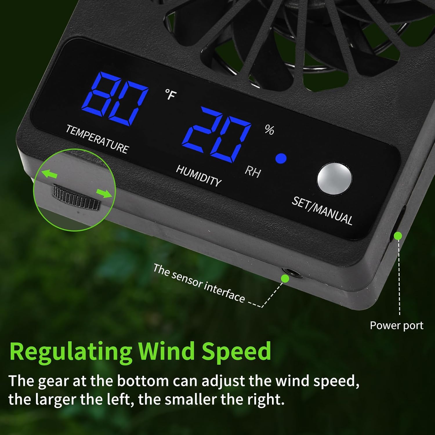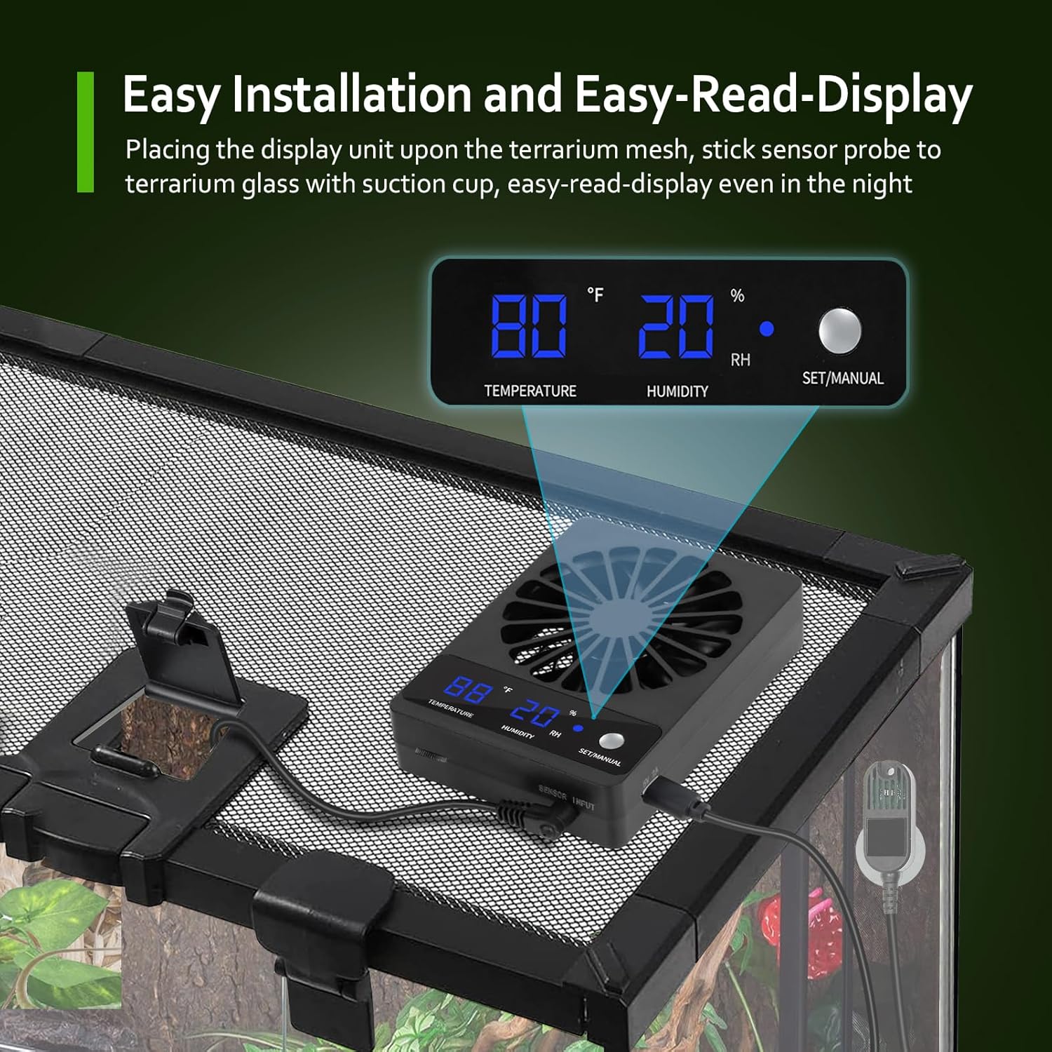 About this item 1. Smart Ventilation: Perfect Climate, 24/7! Automatically activates when humidity exceeds your set limit, ensuring optimal airflow for reptiles like bearded dragons, geckos, and chameleons. Set it and forget it! 2. Real-Time Monitoring: See the Numbers, Trust the Results! The bright LED display shows accurate temp & humidity readings. No more guessing — just set your desired range and let the fan do the rest! 3. Easy Setup: No Tools Needed! Place it on the top grid or use the included hook for quick installation. Perfect for busy pet owners — get it running in minutes! 4. Low Noise: Peace for You, Comfort for Them! Operates at just 28dB — quieter than a whisper. Ideal for bedrooms, offices, or noise-sensitive spaces. 5. Wide Application: From Reptiles to Rainforests! Suitable for bearded dragons, geckos, snakes, and even small greenhouses. › See more product details