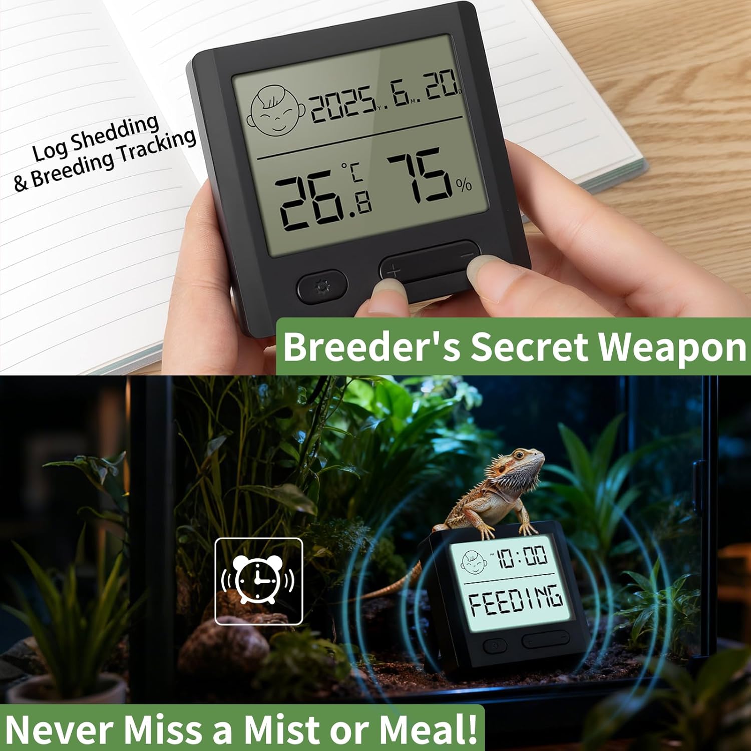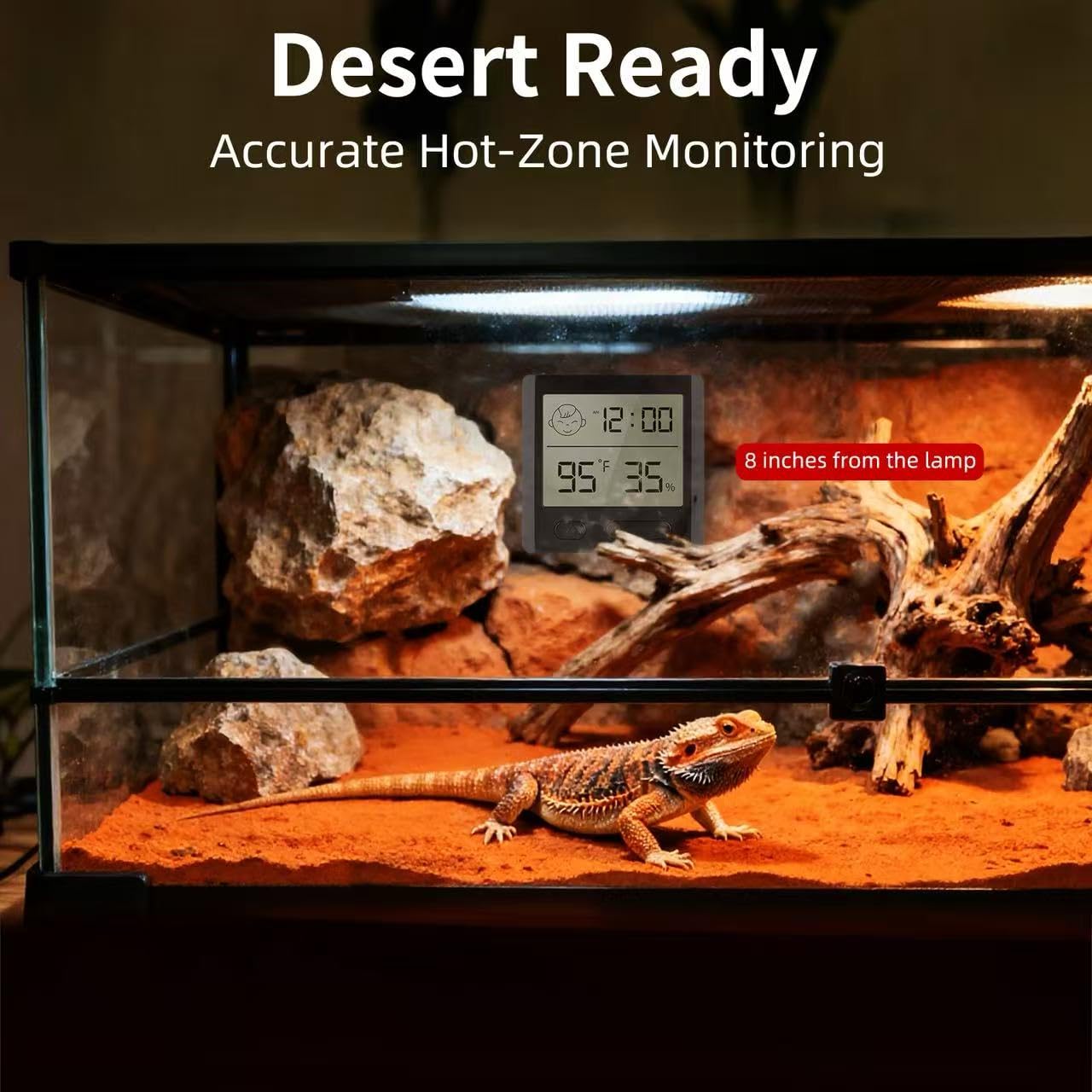 About this item Precision Monitoring – High-accuracy sensor (±1.8°F/ ±1% RH) for 24/7 temperature & humidity tracking, ideal for tropical/desert reptiles. Pet-Safe Design – Waterproof, bite-resistant casing with no sharp edges, perfect for snakes, geckos, tarantulas, and amphibians. Smart Alerts – Customizable high/low alarms (sound + LED flash) to prevent dangerous habitat conditions. Easy Installation – Includes a mini hanging hook for quick attachment to glass, acrylic, or wooden enclosures (20-200L). No tools needed—simply place the hook and adjust for optimal positioning. Energy Efficient – AAA battery powered (6-month life), auto-sleep backlight for nighttime viewing. › See more product details