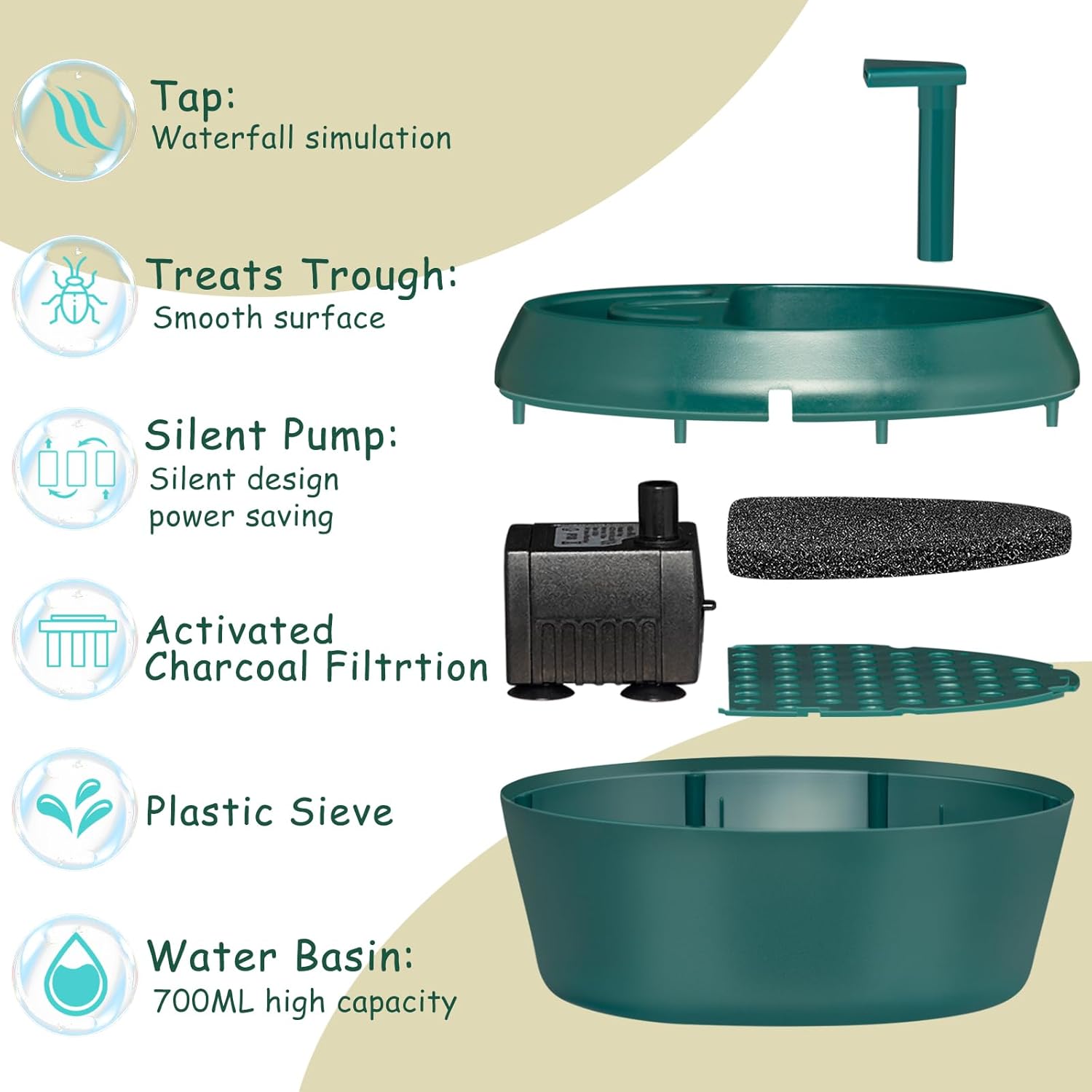 Bring the wild into your home with our chameleon reptile water drinking fountain. This innovative accessory features a low-noise, energy-saving, and eco-friendly automatic circulation system that creates a natural, living water environment for your lizards and other crawling pets. The waterfall-style outlet design simulates the image of wild water flows, enticing your lizards to drink actively. Included is a feeding trough for added convenience. Adjust the flow rate to your liking with the simple button control. With its LED light, this fountain not only hydrates your reptile friends but also enhances the ambiance of their habitat. Keep your scaly companions healthy and happy with this versatile reptile water fountain suitable for snakes, lizards, and more. Experience the wonders of nature right in your own terrarium or tank.