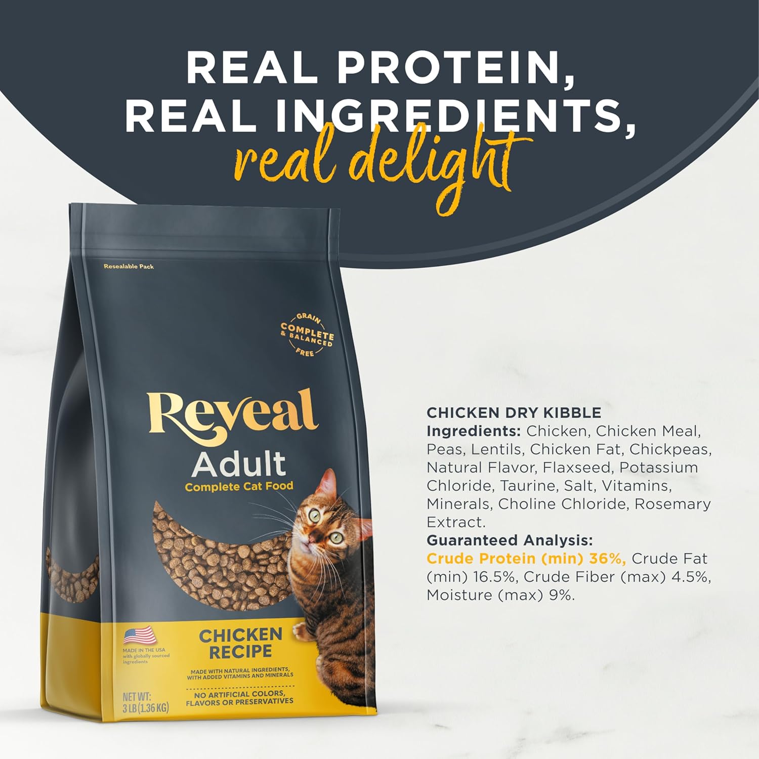 - Directions: For cats up to 5lbs 1/5-1/4 cup per day. For cats 5-10lbs 1/3-1/2 cup per day. For cats 10-15lbs 1/2-3/4 cup per day. For cats 16lbs+ 3/4-1 cup per day. *Based on st&ard 8oz dry measuring cup. Store in cool dry place & seal after opening. Feed with any Reveal wet cat food or treat for added variety, flavor & texture. Daily feeding guide is only a guide as requirements will vary by age, size, & activity level of your can & will depend on if you feed wet food as well. Transition gradually over 10 days recommended.