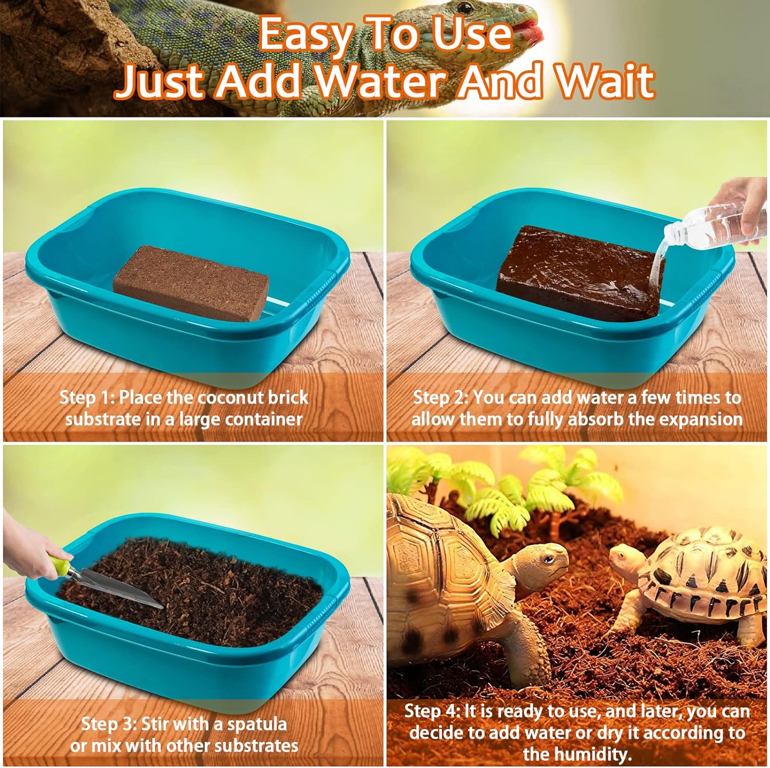 Natural and Organic Material: You will receive 2 pcs coconut fibre bricks, each size 7.8 x 3.9 x 1.97 inch, which are made from natural coconut fibre that is odorless, retains humidity well and also enhances the temperature of the aquarium while stimulating the natural digging and burrowing behavior of small animals, providing a cleaner and healthier living for reptiles, amphibians and invertebrates Odor and Waste Absorber: Natural terrarium substrate breaks down liquids, water and waste sufficiently, while absorbing odors, making indoor tanks smell fresher and look cleaner, far better than wood shavings, stone or other inferior alternatives, helping to maintain a long-lasting and healthy environment Degradable and Compostable: Our coconut fibre substrate is a natural, organic and non-polluting material that is biodegradable and compostable, you can completely dispose of it outside in your garden area or backyard and also use it as a fertiliser for flowers, potted plants and other plants to reuse resources Easy to Use and Store: These coco bricks are compressed and dense. Just soak the brick in water, coco coir will instantly and easily soak up water and expand into a clean, fluffy substrate. Our Coconut husk fiber is a great substrate for any reptile or amphibian that needs a substrate / bedding that can retain moisture Universal Aquarium Substrate: Pure natural terrarium bedding is very soft and comfortable with good breathability, even your pet can breathe freely in the coconut soil. Suitable for frogs, hermit crabs, snakes, turtles, frogs, lizards, chameleons, geckos, salamander,snails and orb pythons, and spiders and other burrowing animals, you can use it to keep your pets with confidence › See more product details