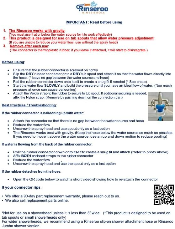 About this item TUB RINSING MADE EASY: You’ll love our bathtub faucet sprayer because it’s easy to use and instantly turns any faucet into a swift rinsing station. With no installation needed, it's ideal for a quick dog bath or other speedy tub rinsing chores. PERFECT FIT: The Rinseroo Tub Version instantly attaches to your bathroom faucet attachment (up to 3" in diameter). Our tub faucet sprayer attachment has a portable design and moves from tub to tub with ease! VERSATILE DESIGN: Not just for the bathroom, our dog washing hose attachment is a game changer. Add a garden hose to extend its reach and turn your faucet into a dog shower head, a plant rinser, and more. NO TOOLS, NO STRESS: Skip the hassle of complicated setups. This lightweight faucet sprayer attachment slips on in seconds and coils up for neat storage, making it the go-to for a quick dog shower or tub clean-up. THERE ARE SO MANY THINGS IT CAN DO: Transform your bathtub faucet adapter into a powerful baby shower attachment, give your pet a dog bath, fill a portable washing machine, and more. This tub faucet attachment simplifies so many of our least favorite chores. › See more product details