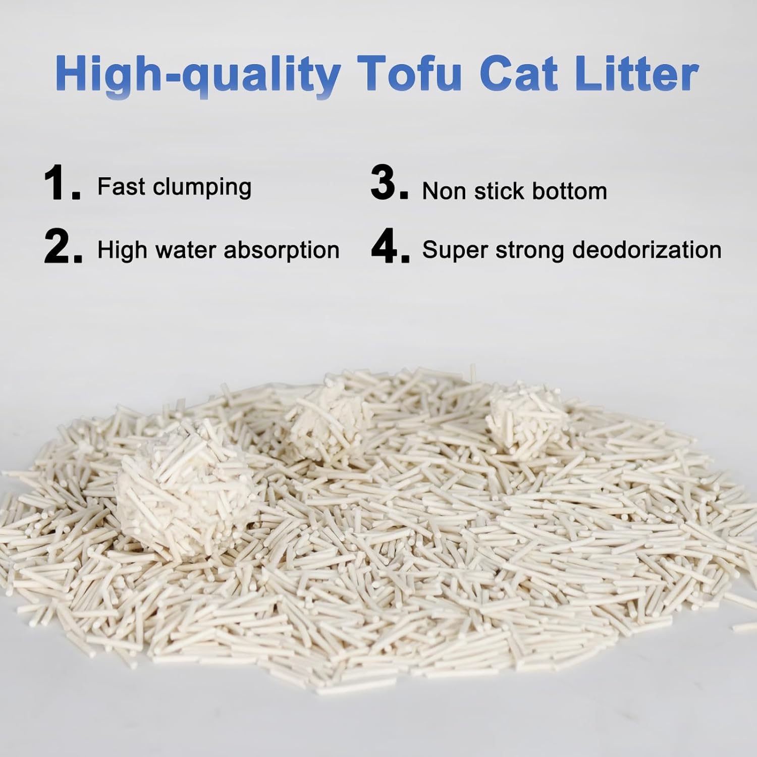 About this item Fast Clumping: This tofu cat litter quickly forms tight clumps in just three seconds, blocking moisture and odors at the source, as well as making litter cleanup a breeze, while minimizing litter consumption for lasting value. Non-Stick Formula: Dust-free, low-adhesion litter won't stick to litter box walls or cat paws, minimizing messes and post-cleaning scrubbing. Its lightweight texture absorbs up to 3 times its weight in liquid while keeping surfaces clean, smooth and comfortable for cats. Easy to Clean: Made from biodegradable natural tofu fibers, this litter dissolves safely in toilets (flush small amounts gradually to avoid clogs). Reduces plastic waste, eliminates heavy litter bags, and makes it easy to have a daily cleanup routine by simply scooping and flushing. Highly Absorbent: This cat litter is designed with high-density porous granules that instantly lock in moisture and prevent odors. A bag of cat litter lasts longer than traditional clay cat litter, saving you money while ensuring an odor-free day and night. Safe for Cats: This natural tofu cat litter is ideal for kittens, senior cats or allergic pets. The soft, rounded granules feel natural under the paws, which facilitates your cat's adherence to the litter box and gives them a better toilet environment. › See more product details