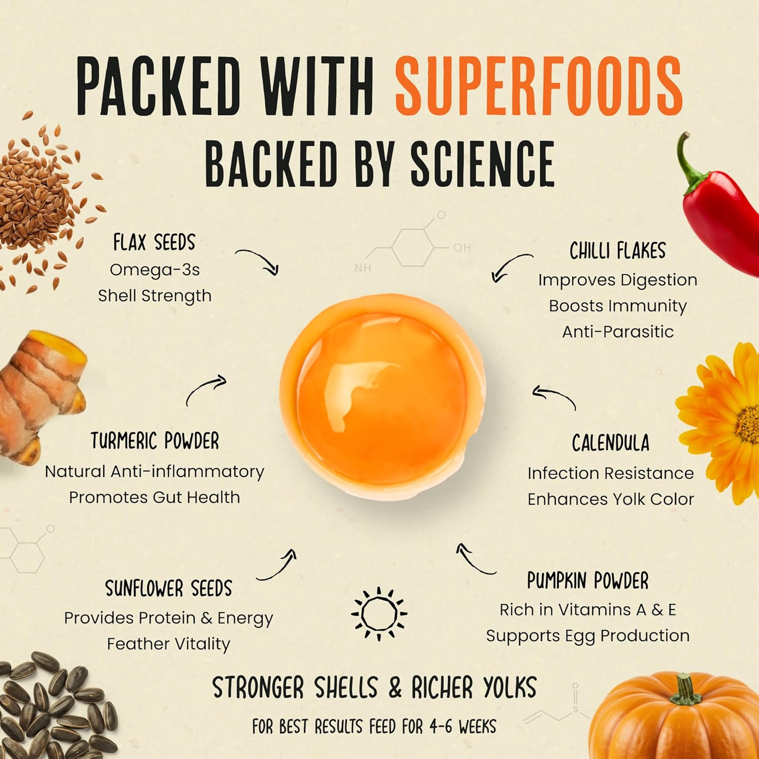 Bring out the best in your hens with Roosty’s Gold Dust Daily Egg Booster, the ultimate all-natural blend of vitamins for chickens and herbal nutrients. Specially crafted to enhance egg quality, shell strength, and immune performance, this daily formula keeps your flock in top shape through every season. The unique combination of marigold, turmeric, carrot, and pumpkin provides natural antioxidants that brighten yolks and support internal health, while flaxseed and calcium build stronger shells and promote omega-3 enriched eggs. Enhanced with brewer’s yeast and chili flakes, this blend supports digestion, nutrient absorption, and overall vitality—acting as a natural alternative to harsh chicken antibiotics or synthetic additives. Whether your hens are laying, molting, or recovering from stress, Roosty’s Gold Dust is the trusted egg booster for chickens used by poultry enthusiasts for vibrant yolks and healthier, happier birds. Pair it with Roosty’s Chicken Immunity & Digestion Booster, Nesting Herbs and Daily Digestive Booster for the complete flock wellness regimen. Your chickens will thank you—with golden, nutrient-packed eggs every day.