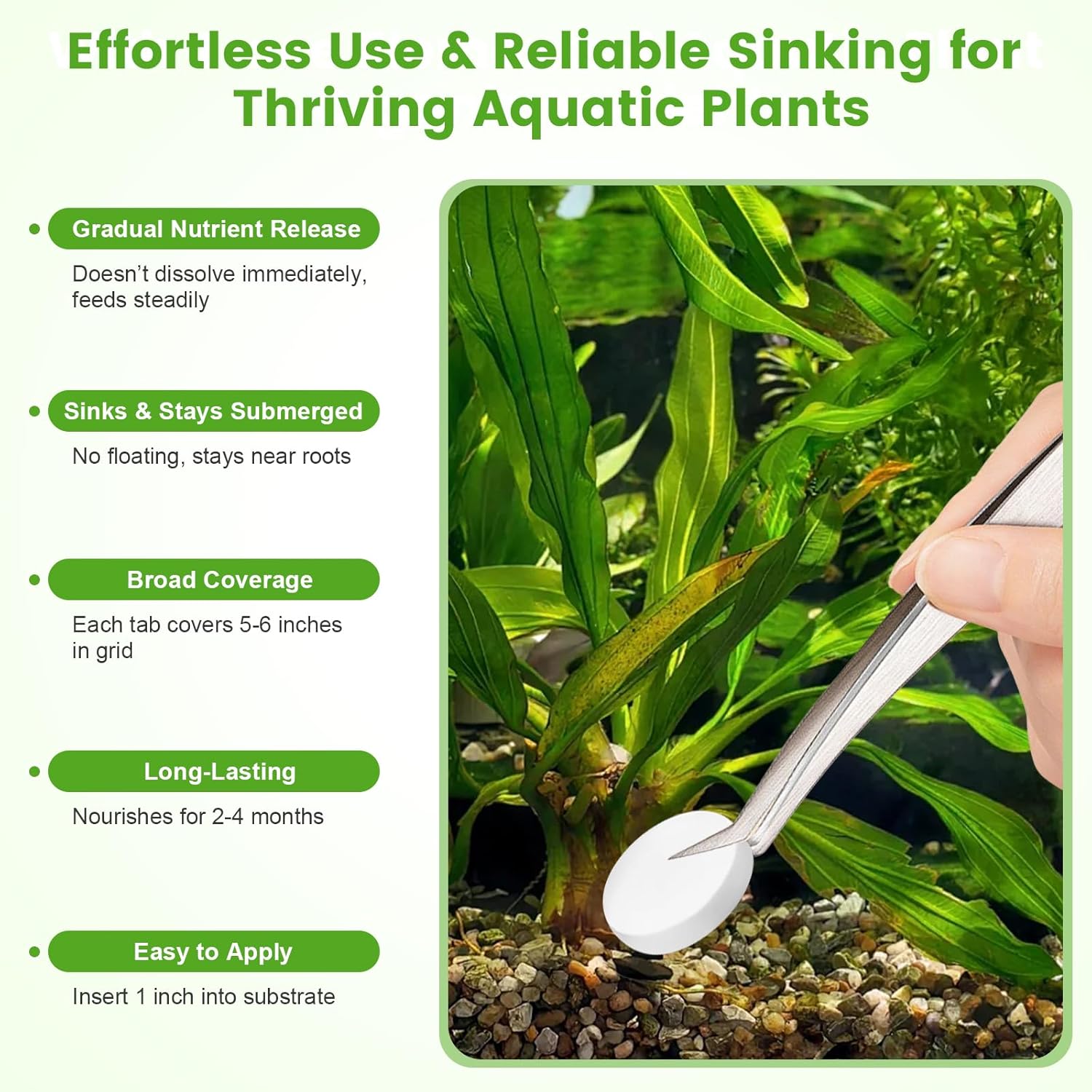 - Directions: Place each tab about 3-5 cm from plant roots, covering approximately 10 cm² of planting area. Each tab provides consistent nutrients for up to 2-3 months. Safe for all fish and shrimp.