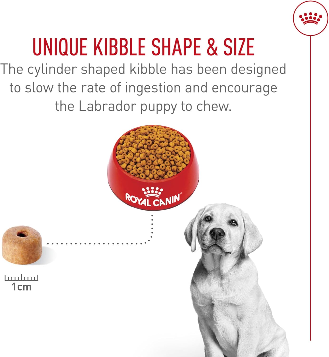 Serve up the tailored nutrition your Labrador Retriever deserves with Royal Canin(R) Breed Health Nutrition Labrador Retriever Puppy Dog Food Dry Formula. Royal Canin makes it easier than ever to feed your dog tailored dog food. This Labrador Retriever food features a specialized donut-shaped kibble designed for your fast-eating Labrador Retriever to slow down and actually chew. Not only that, but this complete and balanced puppy dog food provides the nutrition to help your best friend thrive. An exclusive mix of antioxidants and vitamin E supports their developing immune system and keeps their puppy body growing strong. Calcium and phosphorus provide bone and joint support, while a balanced energy content helps them maintain an ideal weight as they grow. With high-quality proteins and prebiotics, this Labrador dog kibble also helps promote optimal stool quality. Serve your Labrador Retriever Royal Canin Puppy Food and promote your dog's overall wellness with every meal.
