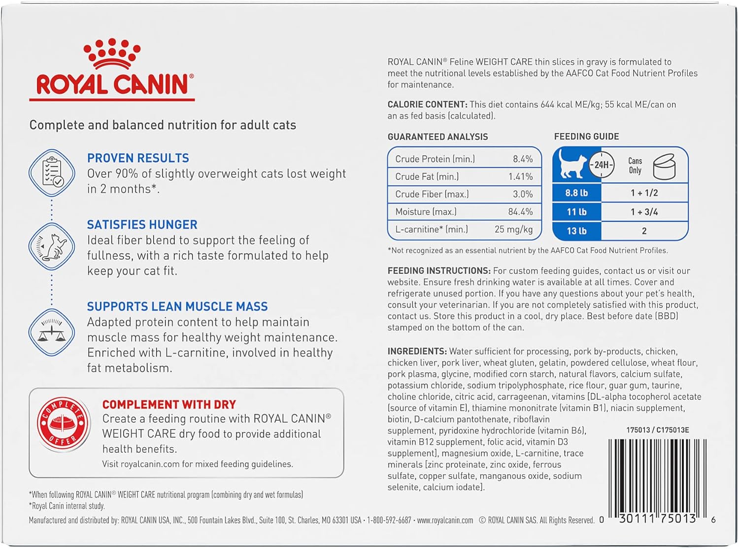 - Directions: Royal Canin Feline Weight Care Thin Slices in Gravy Canned Adult Wet Cat Food is formulated for cats with a body condition score of 4, 5, or 6 out of 9, to help support muscle mass and a more ideal body condition.