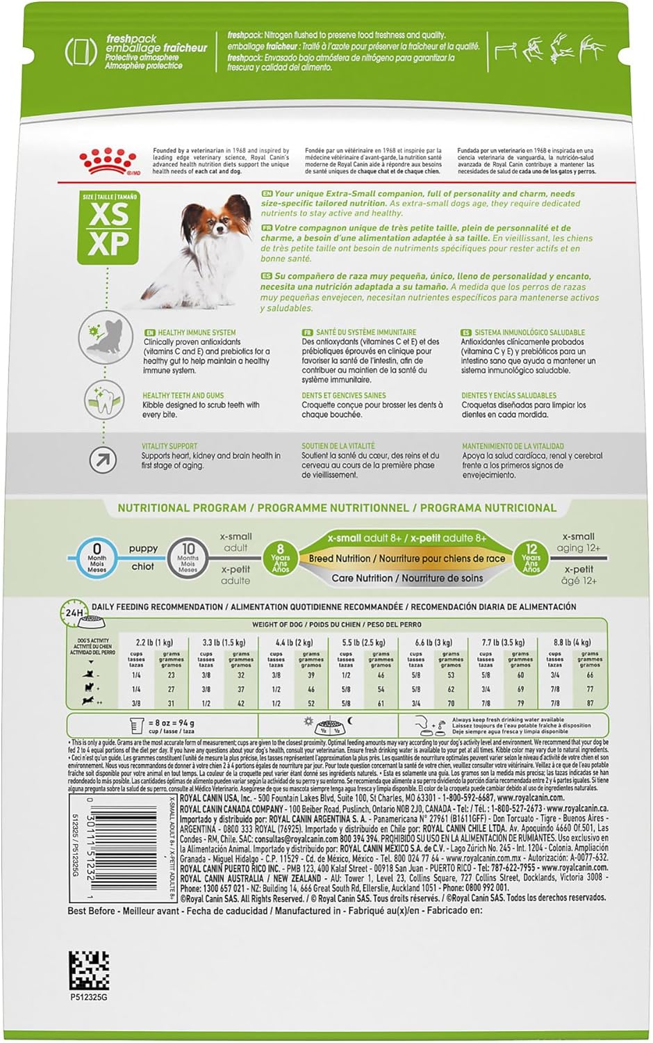 - Directions: Royal Canin X-Small Adult dry dog food is precise nutrition specifically made for toy and miniature breed dogs between 10 months and 8 years old that weigh up to 8 lbs.