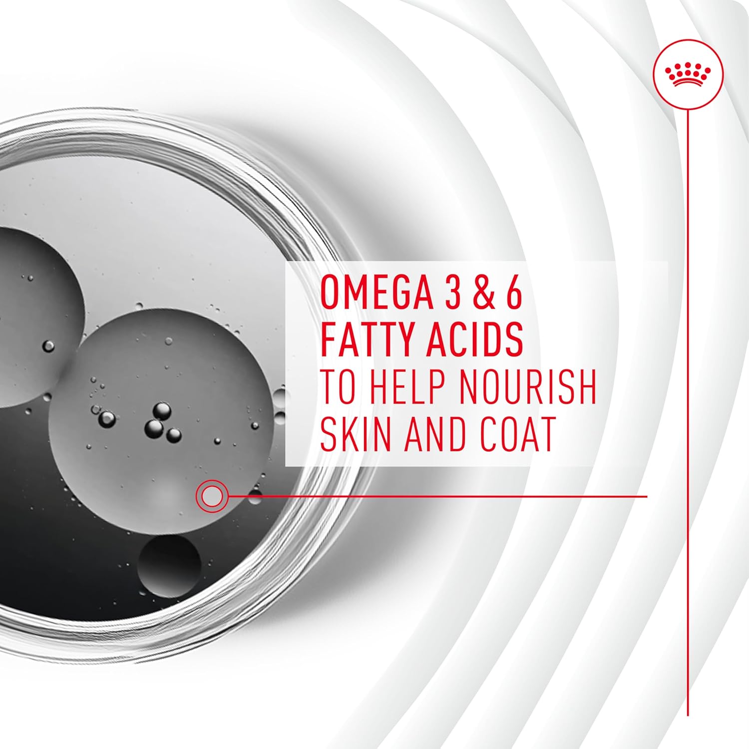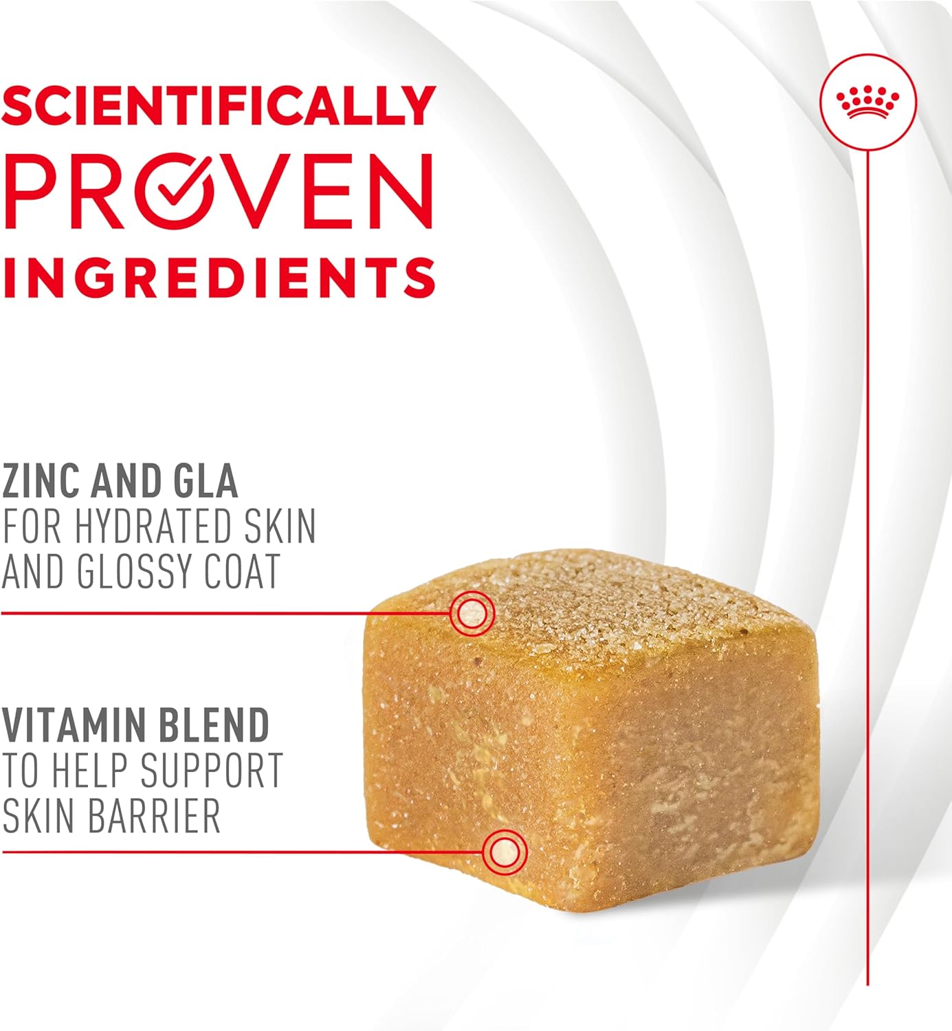 About this item The information below is per-pack only GLOSSY COAT: Omega-6 fatty acids (GLA) and Zinc help keep the skin hydrated and promote good coat quality SKIN SUPPORT: Omega-3 fatty acids (EPA and DHA) promote healthy skin VITAMIN BLEND: Contains a blend of B-Vitamins to help maintain the skin barrier THE PERFECT COMPLEMENT: Designed to complement any Royal Canin diet formulated for healthy pets DEVELOPED BY VETERINARIANS: Royal Canin Soft Chew Supplements are developed by veterinarians to help support your pet's health from the inside out › See more product details