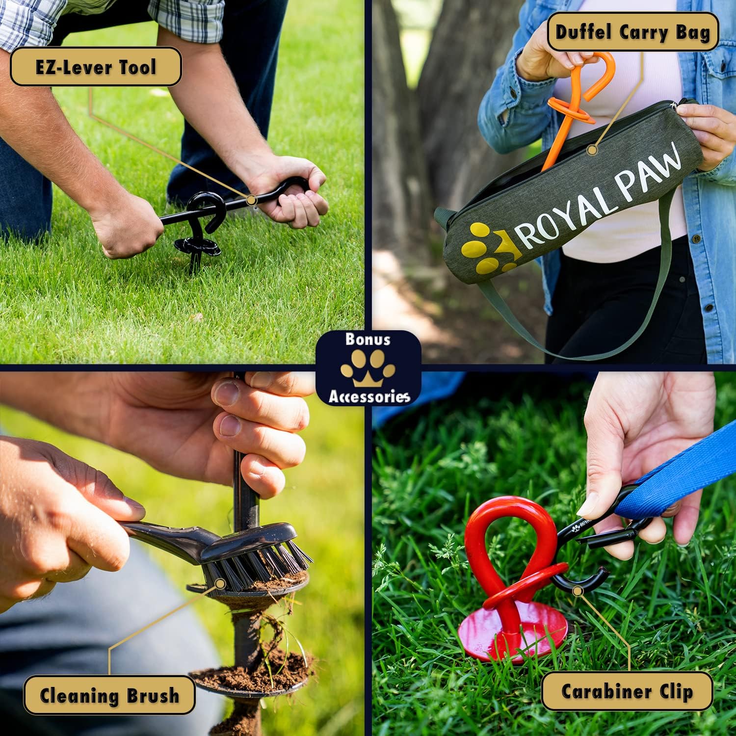 About this item GOT A LARGE DOG? The Royal Paw Tie Out Stake was designed with heavy pullers in mind — hold back extra large breeds up to 210+ lbs. You can rest easy knowing your dog stake can do all the heavy lifting. Try it out! GIVE IT AS A GIFT! Each purchase comes in a sleek and stylish water-resistant packaging that screams luxury without paying the luxury price. With this dog anchor, you give the gift of safety and peace of mind to pet owners. EZ-INSTALLATION! Install in under a minute thanks to our best-in-class anchor design. The Curved Double Blades combined with the Spiral-Tip lets you glide through any surface for a smooth and seamless installation. DOES IT WORK? Yes! Your spiral stake will work on any ground surface including sandy, and clayey soils. For stubborn soils, use the handy metal installation tool included in your kit. DESIGNED IN THE USA! Your Heavy Duty Tie Out Stake has exceptional build quality and is made to last. Extended warranty is available upon registration! Have issues? Our experts are on standby and will reply to you in 12 hours or less. › See more product details