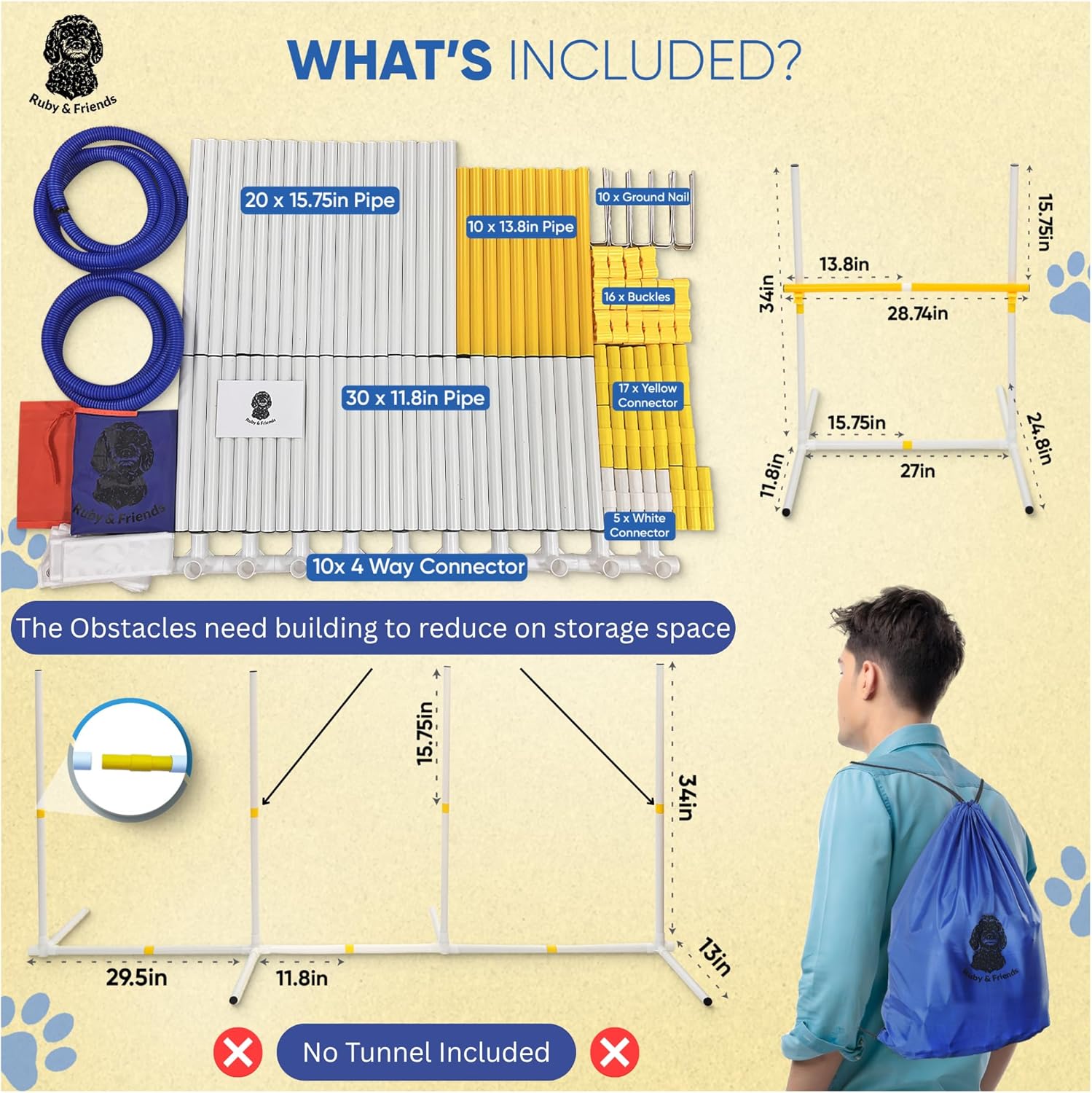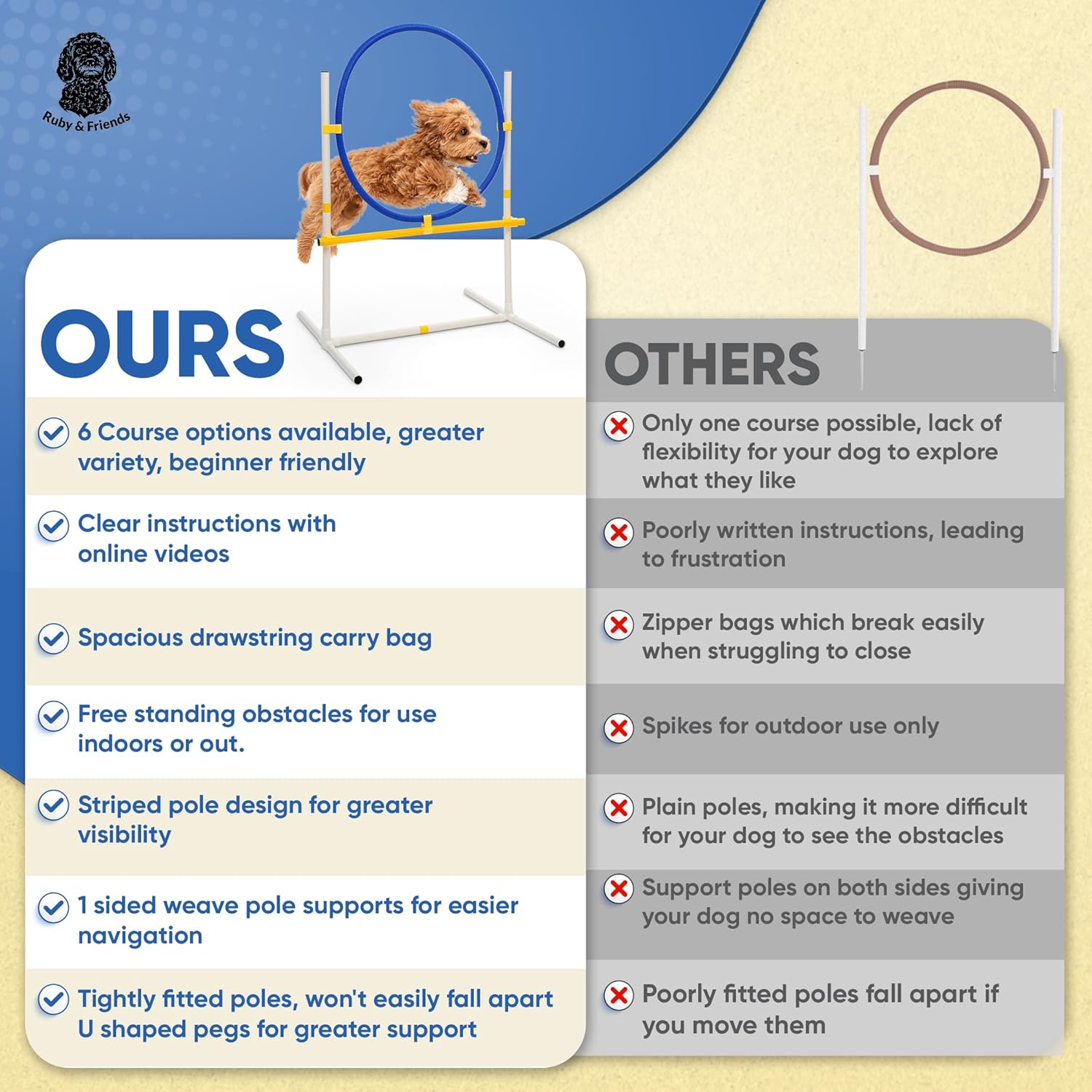 6 COURSE VARIATIONS: Get 6 course variations with the Ruby & Friends Dog Agility Set. Perfect for creating diverse dog agility jumps and dog agility weave poles in your backyard, offering endless fun and exercise for your dog. VIDEO & WRITTEN INSTRUCTIONS: Our dog agility training equipment comes with clear written and video instructions, making it easy to set up your dog agility training equipment jumps and weave poles quickly and without hassle. DURABLE: Designed for durability, our dog agility obstacles are built to last. These pieces won’t easily fall apart, whether you're configuring different setups or readjusting the dog agility course during training. PORTABLE: Featuring a convenient backpack-style carry case, this agility training equipment for dogs is easy to transport and store, perfect for the dog park or backyard. BEGINNER FRIENDLY: With beginner-friendly obstacles, this is the ideal dog agility set. Your dog can enjoy and progress at their own pace without needing additional equipment. › See more product details