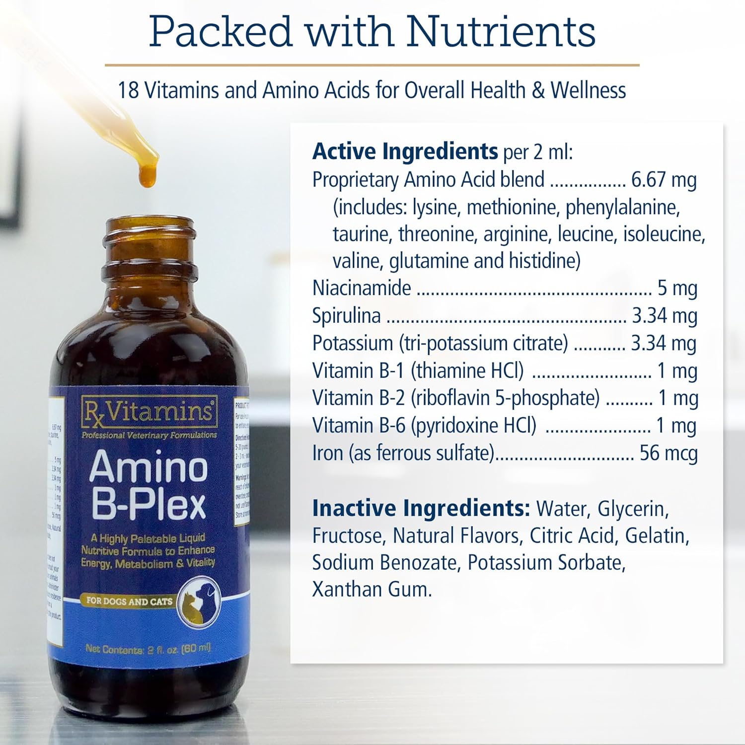About this item Supports Overall Wellness & Vitality: Amino B Plex is formulated with spirulina, a blue-green algae that provides many nutrients, including vitamins, minerals, amino acids, antioxidants, B vitamins including vitamin B1, vitamin B2, vitamin B6, and iron. This versatile liquid supplement is ideal as an addition to your puppy essentials, senior dog supplements, or cat vitamins, as it supports pets at all life stages. Highly Palatable & Appetite Stimulant for Dogs & Cats: Amino B Plex is a great dog weight gainer and appetite stimulant since it encourages consumption, making it beneficial for pets needing a boost in appetite and potential weight gain. Fast Absorption: Amino B Plex ensures rapid absorption of essential nutrients, including B6 vitamin, which is crucial to support energy levels for senior and active outdoor pets. Ideal as dog vitamins and vitamins for cats, this liquid vitamin B complex delivers vital nutrients quickly, promoting overall health and vitality in pets. Convenient Application: Offering essential vitamin B supplements, the highly palatable bacon-flavor liquid allows for easy mixing into pet food, ensuring hassle-free administration and optimal absorption of nutrients. Quality Pet Vitamins & Supplements: Rx Vitamins' Amino B Plex prioritizes dog health and cat vitamin needs with its premium ingredients and formulation. Designed to support overall wellness in pets, it's a reliable choice for pet owners seeking high-quality supplementation for their beloved companions. › See more product details