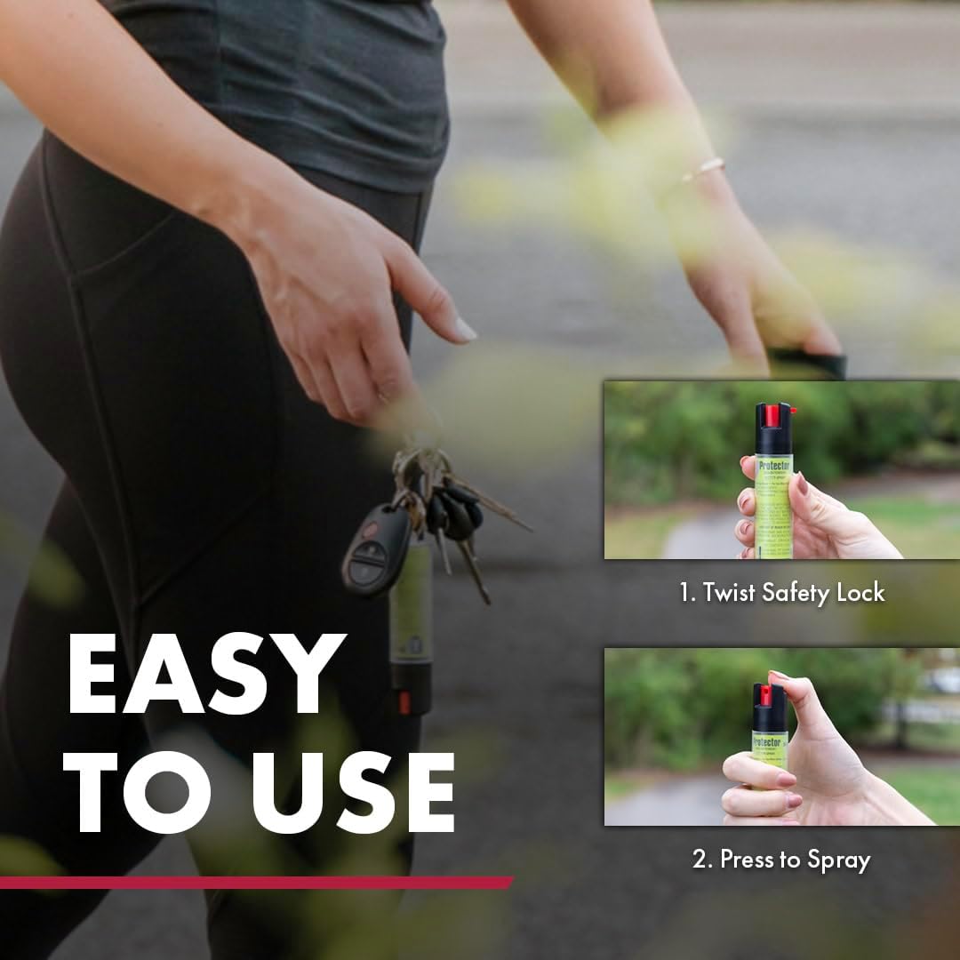 Protect yourself and your pet against aggressive dogs with the Protector Dog Spray with Key Ring. The canister contains 14 bursts (5x the competition) and has an incredible 12-foot (4-meter) spray range that allows for protection at a greater distance from the aggressive animal, allowing you to escape to safety. Protector’s pepper spray formula provides humane yet effective protection; The natural pepper formula contains 1.0% Major Capsaicinoids, the maximum strength allowed by the United States Environmental Protection Agency (EPA). The included key ring attachment easily slides onto keys for quick access to your protection if needed. With an industry-exclusive HPLC laboratory, only SABRE guarantees its maximum strength formulation in every canister to help give you peace of mind, certainty, reliability, and safety when you need it most. Protector Dog Spray is made in USA. Family owned and operated for more than 45 years, SABRE (the creator of Protector) is the #1 brand trusted by consumers worldwide for pepper spray and is a leader in developing safety programs and safety videos to maximize end users’ safety. Empower yourself with extreme stopping power when you need it most.