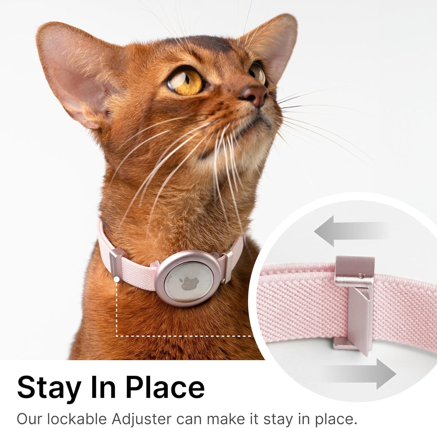 About this item 【Awarding Design, Elastic and Safe】Our original designed cat collar features 1.8 times elasticity, which won a Gold Prize in International Design Awards. This ensures your cat can safely escape in emergencies without injury or choking. NOTE: It prevents cats from choking or injuring even though it is not a breakaway collar. 【Upgraded Cat Collar with Snap】New added aluminum alloy lockable slider - snap can effectively prevent the collar from loosening and falling off. Weighing just 0.18 oz (Size S)/0.3 oz (Size M), our safety collar pro offers cloud-like comfort without causing neck strain. It is adjustable and scratch-resistant. 【Design for Pet】Our metal airtag holder is suitable for 0.4-inch (Size S) / 0.6-inch (Size M) thin collars. Safety cat collar pro is for all cats with an adjustable length of 6 - 12 inches (Size S), 7.9 - 15.7 inches (Size M). NOTE: Airtag is NOT included. 【Secure Fit for Apple Airtag】Designed to complement the AirTag's aesthetics and functionality without compromising on style, it ensures clarity of sound for tracking and boasts a sleek appearance, keeps your cat safe and stylish. 【Superior Materials】Made with premium polyester and hypoallergenic anodized aluminum alloy fasteners, our cat collar and airtag holder is lightweight and gentle on your pet's fur and skin, ideal for daily, long-term wear. › See more product details