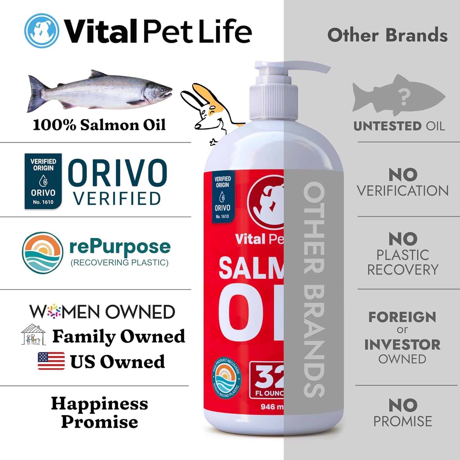 About this item SOFT, SHINY, & SMOOTH COAT - Does your dog, cat, ferret, horse, or energetic ball of fur have a dull, dry or coarse coat? Essential omega 3 fatty acids from our salmon oil supplement will help support healthy skin and coats. You’ll want to hug them even more! DRY SKIN, ITCHING, FLAKING, SHEDDING, & ALLERGIES? - Is your pet constantly itching or scratching due to dry skin and allergies? The essential fatty acids contained in salmon fish oil help support natural allergy defense. Your pet will be much happier playing rather than itching and scratching. INFLAMMATION, JOINT PROBLEMS, & ARTHRITIS? - Have you noticed your pet playing less and having trouble with common activities? The omega 3 in salmon fish oil helps support joint and bone health and also supports a healthy immune system. Normal activities will be funner and more comfortable. SUSTAINABLY SOURCED - Our salmon oil has been sustainably sourced ensuring healthy oceans and safeguarding seafood supplies for the future. PROUDLY WOMEN-OWNED, FAMILY-OWNED, and US-OWNED - We are proud to be Family-owned, Woman-owned, and US-owned. Our products and ingredients are sourced globally so we can give our fur babies the best. › See more product details