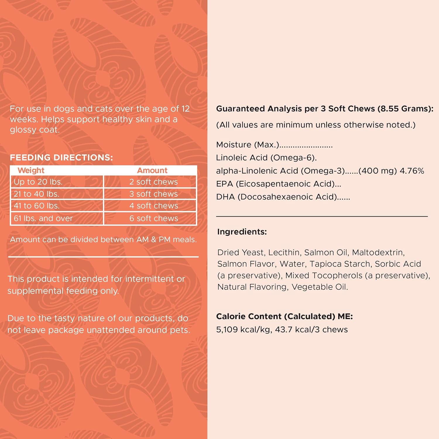 About this item SUPPORTS COAT HEALTH & APPEARANCE: The essential fatty acids found in the derived from salmon oil, fish oil, and flaxseeds promotes and supports healthy skin and fur by working at the cellular level to support the body's natural defenses. Skin defects can be caused by omega imbalances. This dog supplement not only provides vital ingredients, it is formulated to balance the best omega 3 to omega 6 ratio. PREVENTS SKIN ALLERGIES: This anti itch for dogs not only softens the skin, it gives it a glossy shine and helps prevent allergic reactions. This reduces dandruff and itchy skin, helping make your dog feel more comfortable in addition to being healthier! Say goodbye to greasy or dirty coats that have a unpleasant oily smell. These dog bites help kick-start the body’s natural processes to improve fur health. KEY VITAMINS & MINERALS: In addition to omega 3, omega 6 and omega 9, these dog bites contain prebiotics and probiotics to support healthy gut flora for disease prevention. Our enzymes blend helps break down protein, carbs, fats and cellulose for better digestion. Calcium, phosphorus, biotin and zinc help regulate skin function, aid in cell growth and repair, support nutrient utilization and tissue & joint health. PREVENT BALD SPOTS: Dry brittle hair, bald spots, loose and shedding hair, greasy & dirty appearance and an oily smell are all signs of an unhealthy coat. Get your dog the treatment it deserves with this fish oil supplement, infused with vitamin C and brewer's yeast, a rich source of vitamin B. This combination with plenty of moisture, EPA and DHA is the best thing you can do for your pet! MADE IN AMERICA: These dog fish oil supplements are designed for small dogs, large dogs, even massive breeds! The soft chews are delicious treats your pet will love! Recommended dosage varies by animal size, consult the package. Made with cruelty free premium ingredients. › See more product details