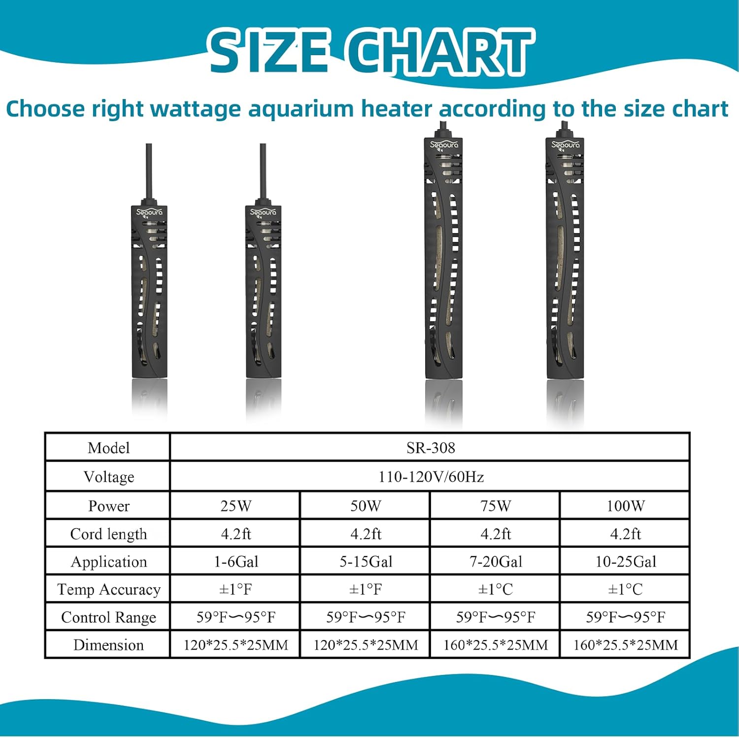 • Small Aquarium Heater for 5-15 Gallon Tank SEAOURA aquarium heater is made of explosion-proof quartz heating tube, which is safer and more reliable than traditional coil heaters. Rated at 110-120 V. Power cord length 4.2 FT, heater length 4.7 Inch