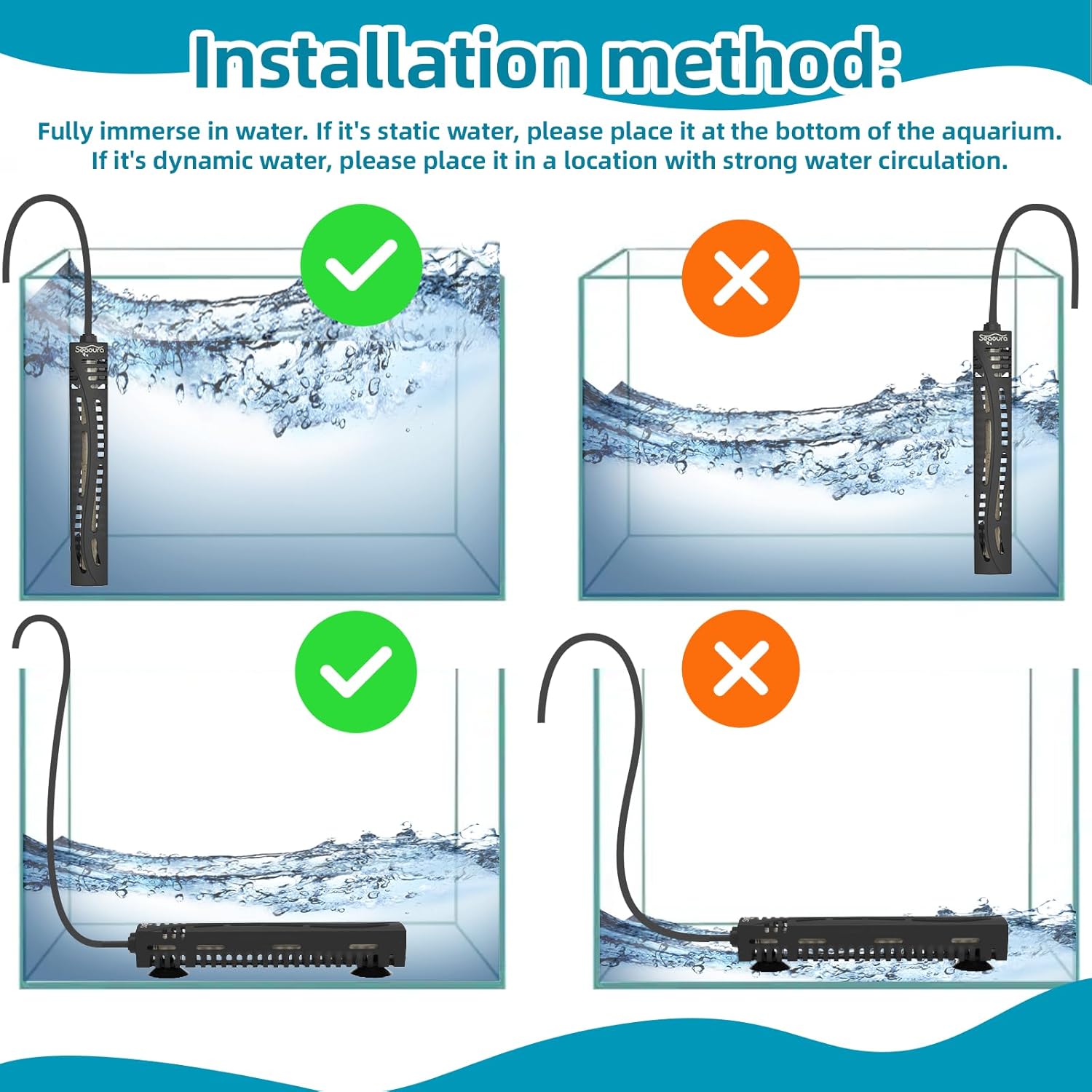 • Easy to install Due to its compact design and strong suction cups,this heater can be easily installed at any location within your aquarium.It is suitable for both freshwater and saltwater environme