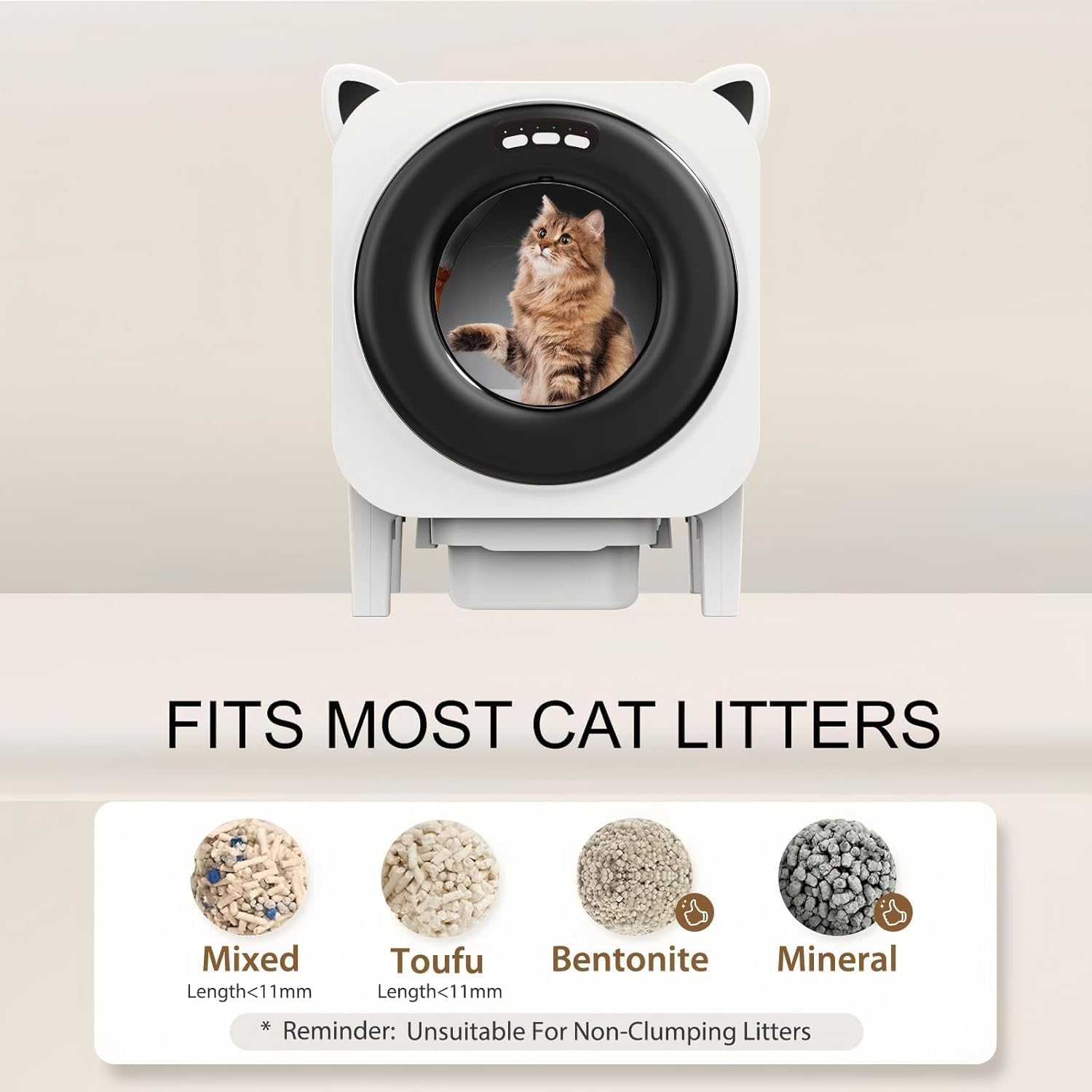 About this item SAFETY FIRST: Equipped with 10 smart safety sensors, self cleaning litter box halts when detecting your cat, preventing pinches or scares during cleaning. Enjoy peace of mind for pet parents. POWERFUL ODOR CONTROL: The full-enclosed design of automatic cat litter box locks away odors, while the built-in Aroma Box neutralizes smells, keeping your home fresh and clean, even with multiple cats. SMART APP CONTROL & HEALTH MONITORING: Connect via 2.4G WiFi to start auto-cleaning, track your cat’s toilet data, and receive health reports. It’s a smart guardian for your cat’s health and cleanliness. LARGE CAPACITY FOR MULTIPLE CATS: The spacious 76L chamber fits cats from 2lbs to 24lbs. With an 8L waste bin, automatic litter box holds up to 10-14 days of waste for one cat, perfect for long trips. QUIETER OPERATION: The self-cleaning litter box is designed to operate at a noise level of less than 32 decibels, allowing your home to remain quiet 24 hours a day. › See more product details