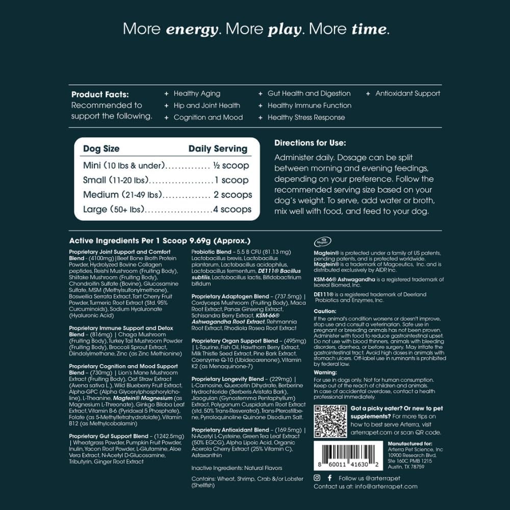 About this item Comprehensive Wellness and Longevity Support: Our all-in-one, senior regenerative formula is designed to turn back the clock, restoring youthful energy and mobility in aging dogs who have begun to slow down. This daily supplement supports healthier joints and mobility, provides targeted relief for arthritis pain, and addresses age-related cognitive and mood decline. It also boosts vitality, digestion and gut health, organ function, cellular support, skin and coat health, and overall wellness for optimal longevity. Premium, Natural Ingredients: Made with 63 powerful ingredients for maximum anti-aging benefits, Arterra’s formula is developed by veterinarians and backed by science to ensure the highest quality and efficacy. Our product delivers more comprehensive health support than others on the market, significantly outperforming competitors in both ingredient quality and dosage. Made in the U.S.A., 100% filler-free, and backed by our Results Guarantee, Arterra is the superior choice for your dog’s health needs. Advanced Hip & Joint Mobility Care: Promotes joint health, eases discomfort, and supports connective tissues. Loaded with 11 effective ingredients, including Glucosamine, Chondroitin, Bone Broth Protein, Collagen Peptides, and MSM, our formula aids in hip and joint lubrication and cartilage health, ensuring your dog maintains mobility and comfort. Optimal Digestive Health: Infused with probiotics and prebiotics, our supplement improves gut integrity, supports efficient digestion, and helps alleviate gastrointestinal issues for enhanced overall well-being. Cognitive Function Enhancement: Supports brain health and enhance mood stability with Fish Oil rich in Omega-3 EPA and DHA, Magnesium L-Threonate, Lion’s Mane, and other functional nutrients that promote cognitive function, helping your senior dog stay sharp, alert, and mentally active as they age. Easy To Use: Arterra is simple to administer—just mix the appropriate scoop size with your dog's daily food based on their weight, making it an effortless and tasty addition to their wellness routine. See results in as little as one week to 30 days, as the benefits are cumulative and amplify over time. › See more product details