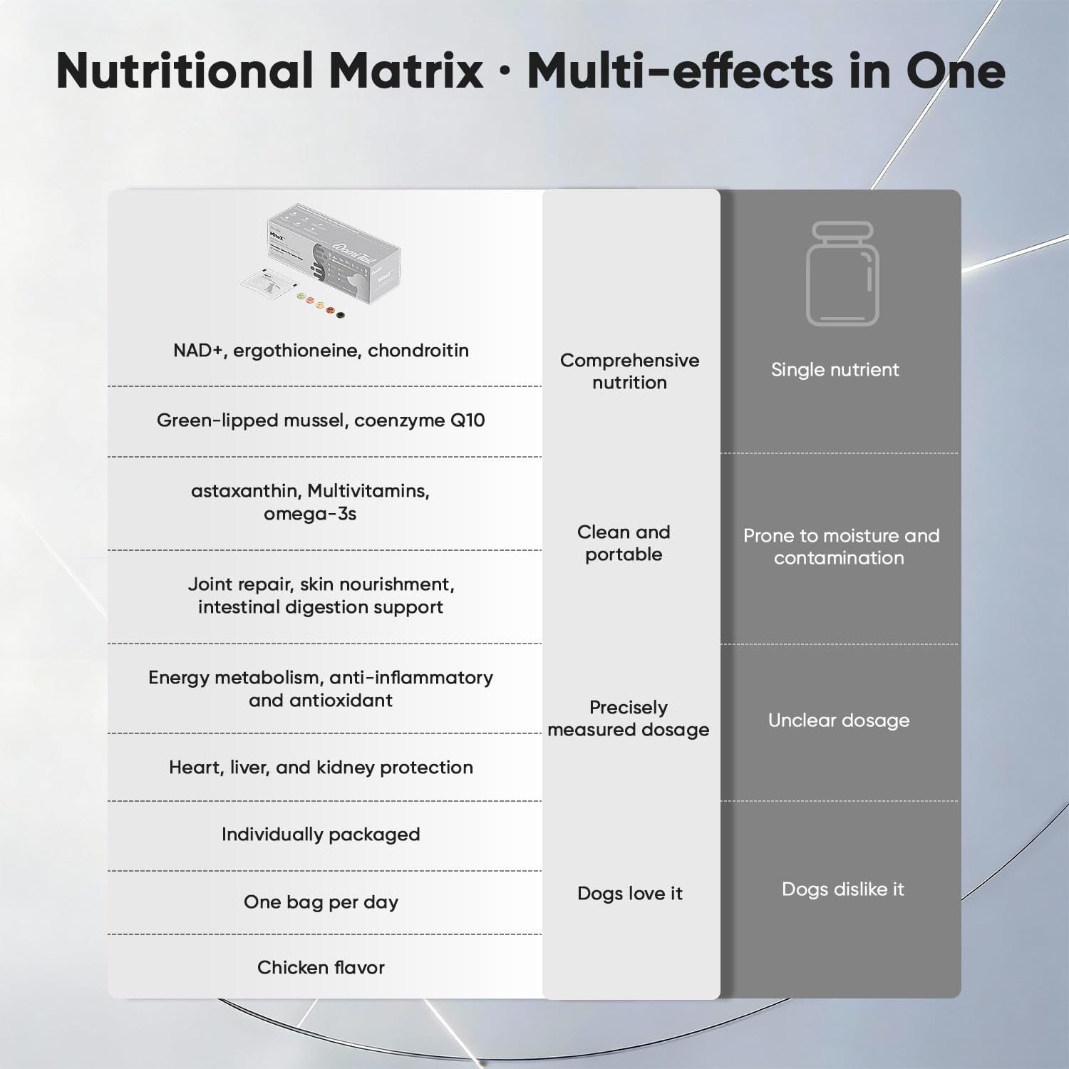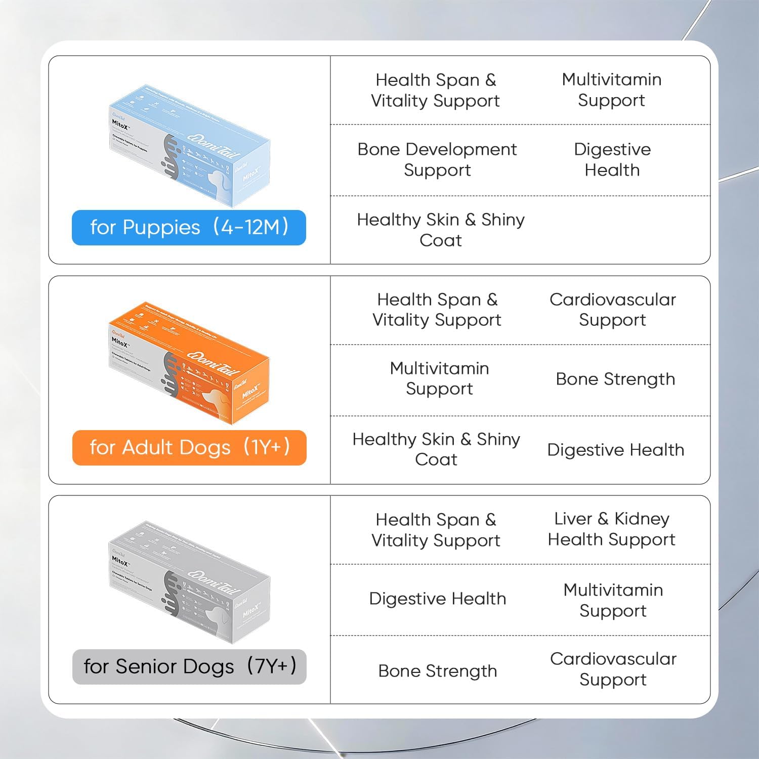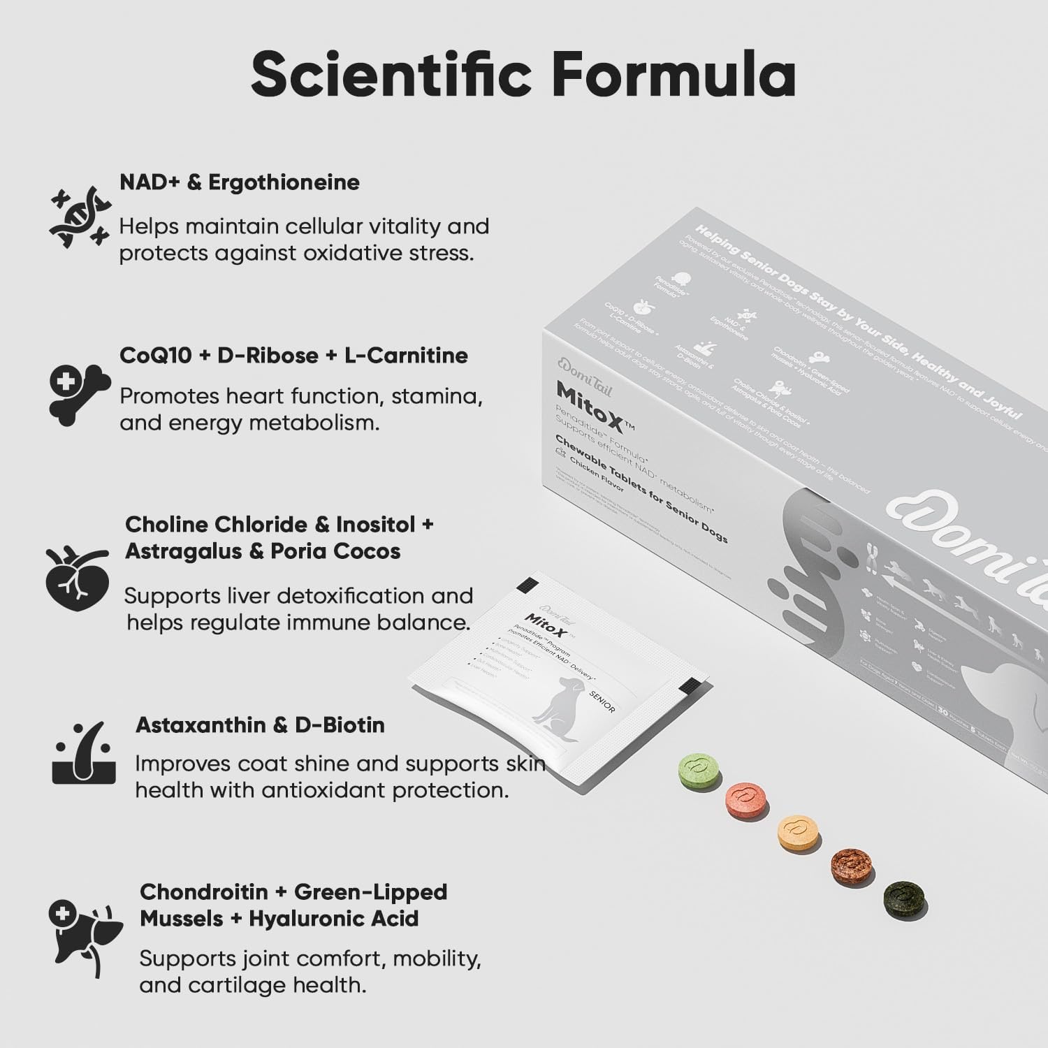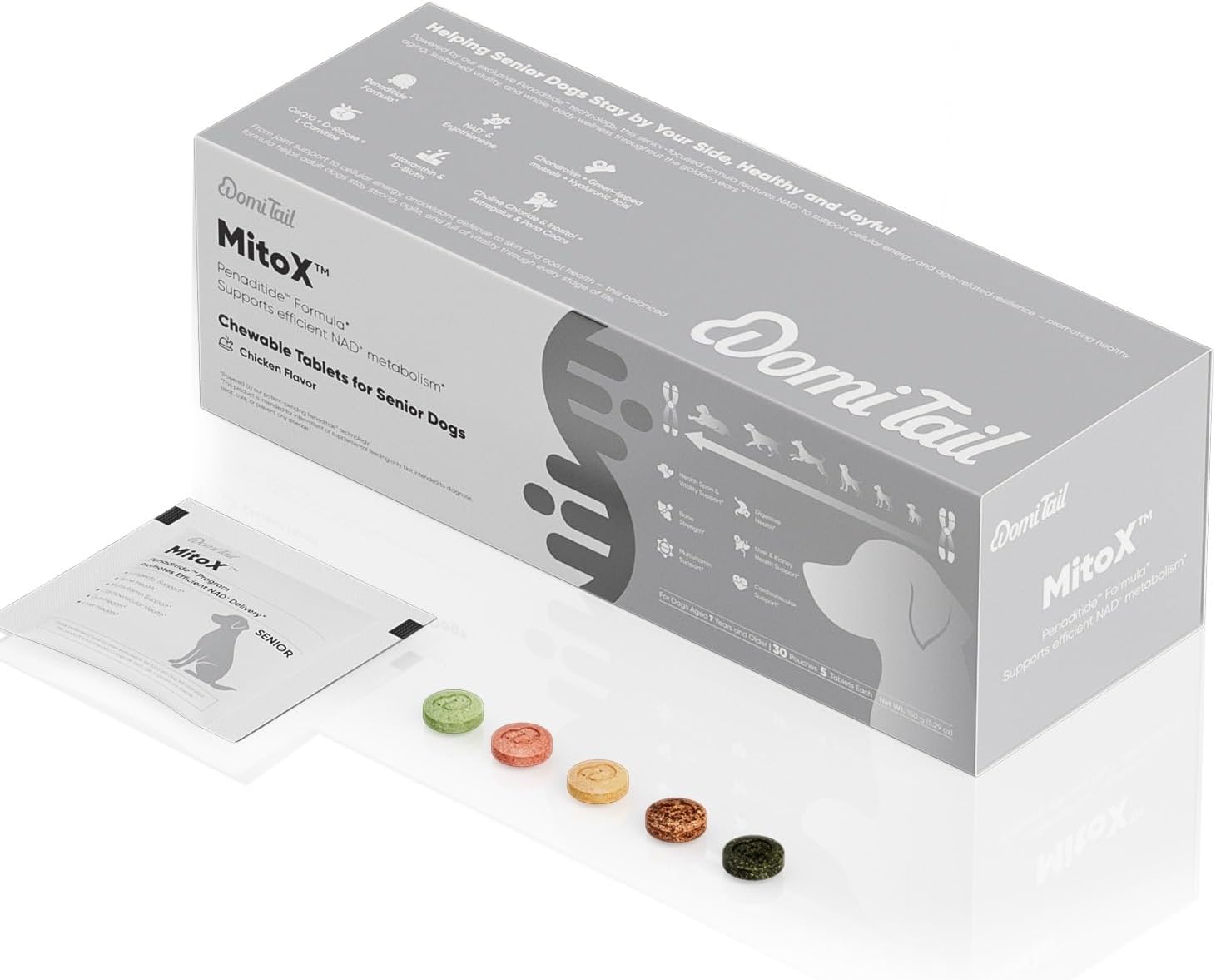 Tailored Daily Support for Senior DogsAs dogs age, their nutritional needs evolve. Domi Tail Senior Dog Supplements are designed to support dogs aged 7 and above throughout key areas of wellness. The blend features Penaditide Formula, a proprietary composition that delivers age-appropriate nutrients in scientifically balanced ratios. It helps maintain joint flexibility, cardiovascular function, liver and kidney balance, and skin and coat condition.Nutritional Role of NAD⁺ in Aging PhysiologyA key ingredient in this blend is NAD⁺ (Nicotinamide Adenine Dinucleotide), a coenzyme naturally found in cells. In dogs, NAD⁺ levels tend to decline progressively with age, which may affect mitochondrial function and cellular energy turnover. NAD⁺ supports energy transfer and redox balance—both vital for maintaining cellular stability. It also helps regulate proteins involved in DNA maintenance and metabolic coordination. By providing consistent dietary support, this blend helps reinforce NAD⁺ availability in senior dogs, contributing to sustained vitality and physiological resilience.Science-Driven Composition for Everyday WellnessThis supplement reflects a proactive approach to senior dog care, combining NAD⁺ with other well-researched ingredients such as CoQ10, chondroitin, L-carnitine, biotin, and botanical extracts. Together, they form a comprehensive nutritional strategy tailored to the needs of aging dogs.Convenient Daily Format for All BreedsEach moisture-resistant sachet contains 5 chewable tablets, calibrated for once-daily use. By combining a range of functional ingredients into a single portion, this supplement simplifies daily care and eliminates the need to manage separate products. Suitable for all breeds and sizes, the tablets can be served directly or mixed with regular food—offering a practical solution for everyday feeding at home or on the go.