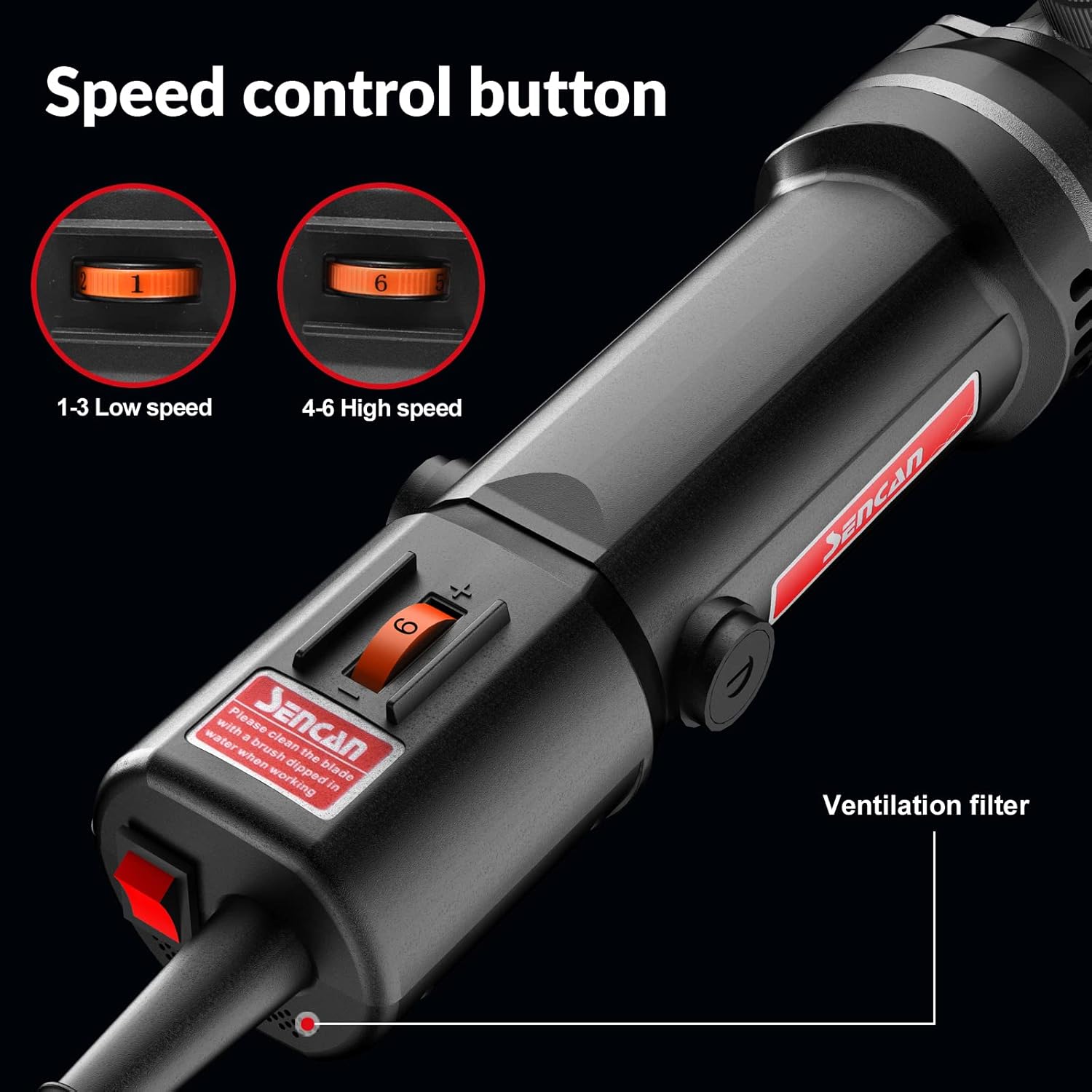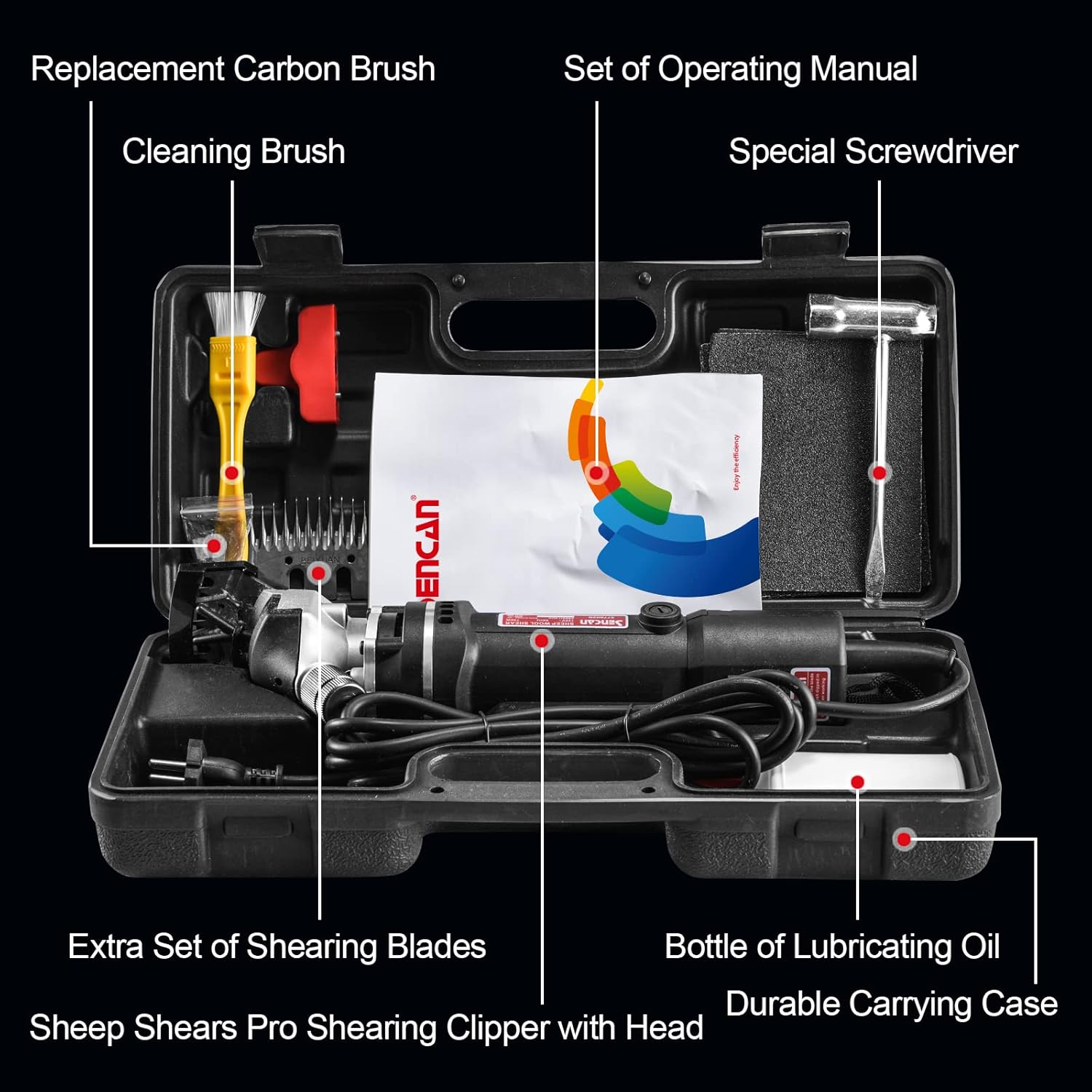 About this item 【PROFESSIONAL SHEEP SHEARS】: SENCAN sheep shear, a power of 750W and provides up to 2400r/min with comfortable grip protection to improve efficiency, this electric clippers makes your job of shearing much more easily and effectively. 【HIGH QUALITY MATERIAL】: Full aluminium head and strengthened nylon polymer body for vibration reduction and durable use. Removable sharp blade, Sharp blade with high hardness, high heat resistance, toughness and will not harm your sheep. 【Powerful Motor】: 5-10 sheep can be cut in an hour, suitable for home farming or pasture farming. Labor saving, the scissors grip structure humanized, long-term shear hands will not fatigue.Adjustable blade tension with rotatable button helps shearing go smoothly and quickly.Ventilators prevent the blades and head from overheating while clipping. Suitable for sheep, goats, llamas, alpacas. Do not recommend it for Cats and Dogs. 【ADJUSTABLE SPEEDS CONTROL】: SENCAN Sheep Shears electric Machine is speed adjustable. Low speed (1-3) offers precision performance to clip-sensitive areas while high speed (4-6) delivers maximum power for faster trims and full-body shaves down. Whether you're a beginner or a pro, the 6-speed control helps you get things done quickly and easily. 【NOTE】The Rotatable button was adjusted so you can use it without adjustment. When using electric sheep shears, remember to lubricate the blades. Remember that the machine cannot run at idle. It is easy to get hot when two blades rub together. Please use the cooling spray every few minutes, take short breaks during shearing, clean the blade in time and don't run idle to prevent the blade from overheating. And Note its size and weight, it may be large and heavy for someone. Pls read the operating instructions carefully before use. › See more product details