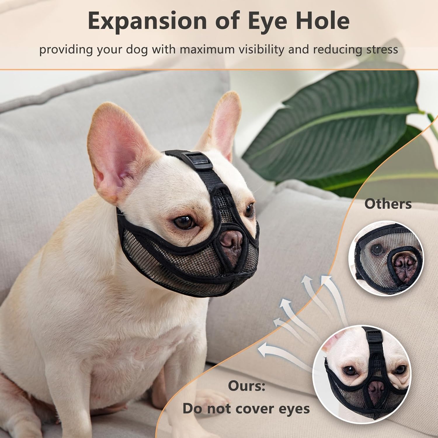 OPEN EYE HOLE DESIGN: Features a uniquely designed open eye hole that provides your French Bulldog with a full field of vision, reducing anxiety and allowing them to navigate their surroundings confidently and comfortably during walks or training. BREATHABILITY & COMFORT: Crafted from soft, lightweight mesh material with soft edges to prevent chafing; the breathable design ensures optimal airflow for easy panting and drinking, keeping your Frenchie cool and content even with extended use. SAFE FIT: Equipped with an adjustable T-shaped buckle for a snug, safe fit specifically tailored for short-snout breeds; prevents the muzzle from being removed while ensuring your pet's comfort and safety. MULTIFUNCTION: This bulldog muzzle offers reliable protection by preventing biting, excessive barking, and unwanted licking, making it ideal for training sessions, vet visits, grooming, or social outings in public spaces. VERSATILE SIZING: Available in multiple sizes specifically measured to fit French Bulldogs and other similar short-snout breeds, ensuring a comfortable and secure fit for your unique pup without restricting movement. › See more product details
