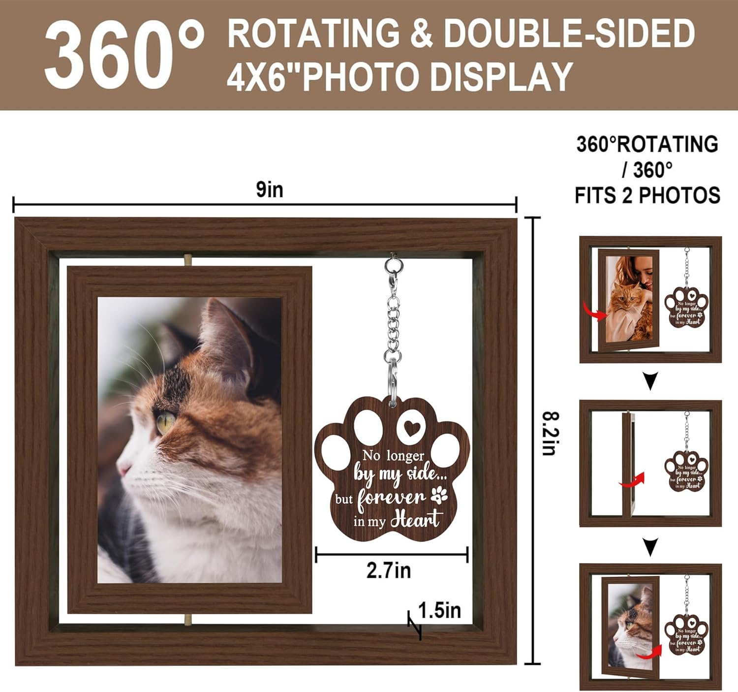 About this item Cat Memorial Gifts for Loss Of Cat - Our Cat rotating memorial picture frame is a beautiful pet memorial gifts,that will give strength to friends who have lost their pets as a spiritual support, it's perfect as a cat memorial gifts, pet memorial gifts for cat, loss of cat sympathy gift. Pet Memorial Cat - The loss of a pet can be devastating as pets, no matter how big or small, are part of our family. Pay tribute to your furry companion with of our pet remembrance picture frame beloved pet cat picture frame that has passed away,besides you will receive a card,where you can write down what you want to say to your cat. Cat Loss Sympathy Gift - Our 360 degrees rotating floating frames are made of lightweight wood with a unique design vintage wood texture finish and which match up special meaning by engraving inspirational inscriptions and dedications to their memory, No longer by my side, but forever in my heart. Cat Passing Away - Pets are our eternal family. Cherish the memory of your beloved pet with our beautiful cat memorial picture frame. Whether you are in search of a loss of cat sympathy gift or a cat memorial gifts, you’ll find this one is ideal for anyone who’s recently lost a pet,It's the perfect sympathy gift for anyone who has recently lost their furry friend. Celebrate a cat's life with a lasting memory keepsake. Cat Remembrance Gifts - Retain the beautiful moments with our pets with our exquisite photo frames.This beautifully designed wooden photo frame measures 9x8in and can perfectly accommodate two 4x6in photos, allowing you to display joyful moments on one side and precious pet memories on the other. perfect given to pet lovers or used as home decor. › See more product details