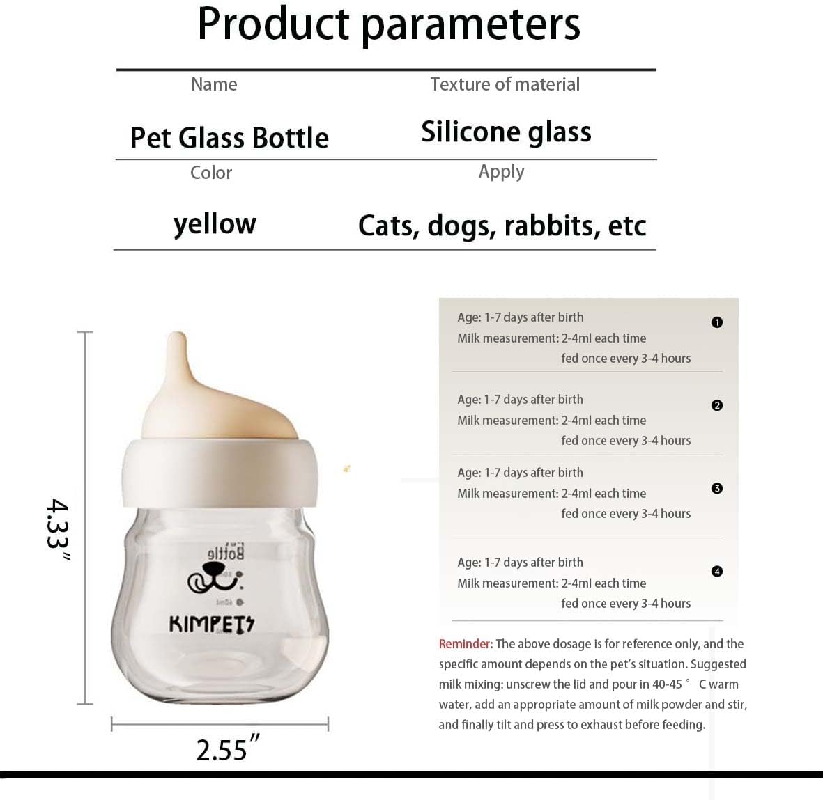 About this item effortless feeding - perfect for even the tiniest newborns our kitten nursing bottle features a natural breast-like pacifier, making it easy for kittens and puppies to latch on. no more struggling with complicated feeds—just pure, stress-free nourishment. goodbye bloating – say hello to air-free feeds our bottom air return system prevents bloating by ensuring zero air intake while feeding. your kittens will feed comfortably and happily—no more bloated tummies after every meal! controlled milk flow – say goodbye to choking hazards with a uniform flow rate and 13° tilt design, your kitten can drink cat milk for kittens without risk of choking or excessive spillage. just pure, safe feeding every time. spill-free, mess-free – designed for quick cleanup cleaning up after feeding time is effortless with our wide bottle neck and easy-to-detach pacifiers. designed for minimal mess, even with multiple feeds a day. leche para gatos bebes has never been simpler! built to last – high-quality borosilicate glass for ultimate durability our kitten bottle is crafted from top-tier borosilicate glass, resistant to heat and corrosion. perfect for steam or uv disinfection, ensuring years of safe feeding! › See more product details