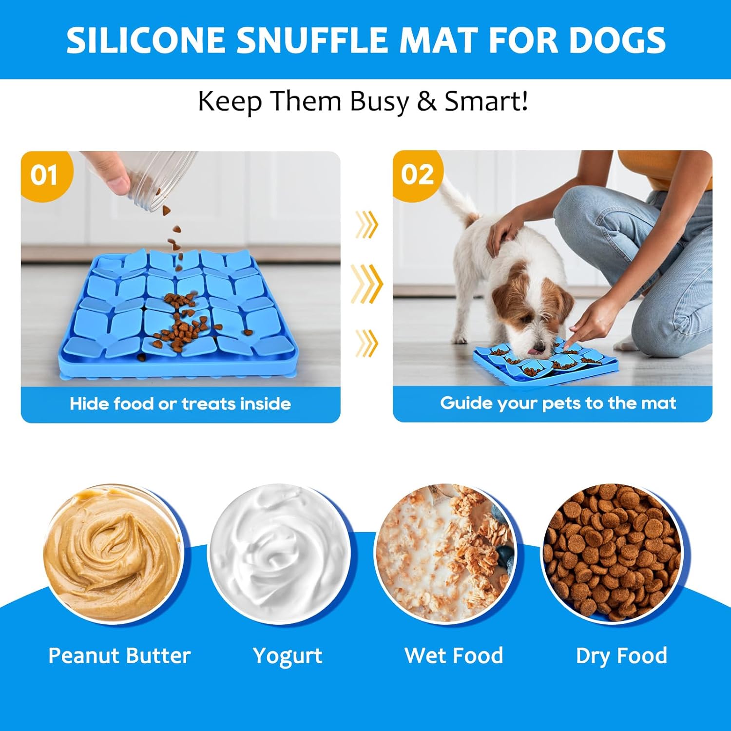 About this item Snuffle Mat and Licking Mat - It can be a dog lick mat or snuffle mat, very useful on improving your dogs' digestion and mental health. Easy to Clean, Dishwasher Safe - Unlike traditional fabric Snuffle Mat, OurMiao snuffle mat is made of premium & safe silicone, can be used at temperatures from -20 °C to 250 °C(Refrigerator, Oven, Sterilizer), suitable for dry food and wet food, very hygienic for pets. You can rinse it or put it in dishwasher for cleaning, very convenient. Useful Design - Up to 100 powerful suction cups on back, it can stick to the tile or wooden floor, so you won't worry dog move it here and there in your house. Also you can use it together with peanut butter or other treats for distracting pets while bathing or grooming. Many Benefits - This silicone dog treat mat is perfect for slow down eating and smell training, slower eating is good for their digestive system, smell training is a nice way to enhance their smell ability and relief stress, avoid destroying furnitures when stay home alone. Nice Gifts for Fur Babies - This pet snuffle mat is suitable for small medium large breed dogs and all cats, the package includes 1pc Blue Mat and 1pc Purple Mat. › See more product details