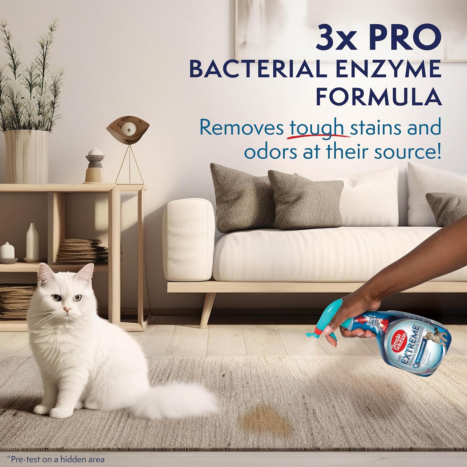 Simple Solution Extreme Cat Stain & Odor Eliminator is a powerful enzyme formula created specifically for feline messes, making it the ultimate cat pee cleaner and urine remover for your home. Cats can leave behind some of the toughest odors, and this advanced spray is designed to permanently neutralize even the most stubborn stains and smells. Whether you’re dealing with cat urine, feces, and vomit, this strong smell destroyer penetrates deep into carpets, rugs, upholstery, and bedding to eliminate pet messes at the source and stop re-marking behaviors. Unlike ordinary cleaners that simply mask odors, this feline odor control spray breaks down the molecules in pet waste with a professional-strength enzyme and Pro-Bacteria blend, ensuring long-lasting freshness. It works as a litter box deodorizer, carpet cleaning solution, upholstery spot treatment, and rug shampoo aid, giving you multi-surface flexibility wherever accidents happen. The formula doesn’t just clean—it acts as a pet mess eliminator and accident neutralizer, restoring cleanliness and freshness throughout your home. The innovative 3-in-1 nozzle allows you to choose from foam, mist, or stream application, so you can precisely target stains on any water-safe surface. Use foam for set-in carpet stains, mist for general deodorizing, or stream for upholstery spot treatments and hard-to-reach areas. From couches and mattresses to floors and rugs, this versatile spray provides a reliable solution for housebreaking aid and everyday feline cleanup. Safe for pets and children when used as directed, our Extreme Cat Stain & Odor Eliminator is trusted by cat parents everywhere to restore a clean, welcoming home. Say goodbye to lingering odors and unsightly stains—this carpet deodorizer and home floor freshener leaves your space smelling clean, looking fresh, and clear of cat-related messes. Keep your home comfortable and smelling fresh with a cat urine remover that truly works, even on the toughest feline accidents.