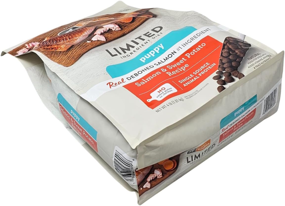 4 pound bag of Simply Nourish puppy salmon and sweet potato limited ingredient dry dog food.