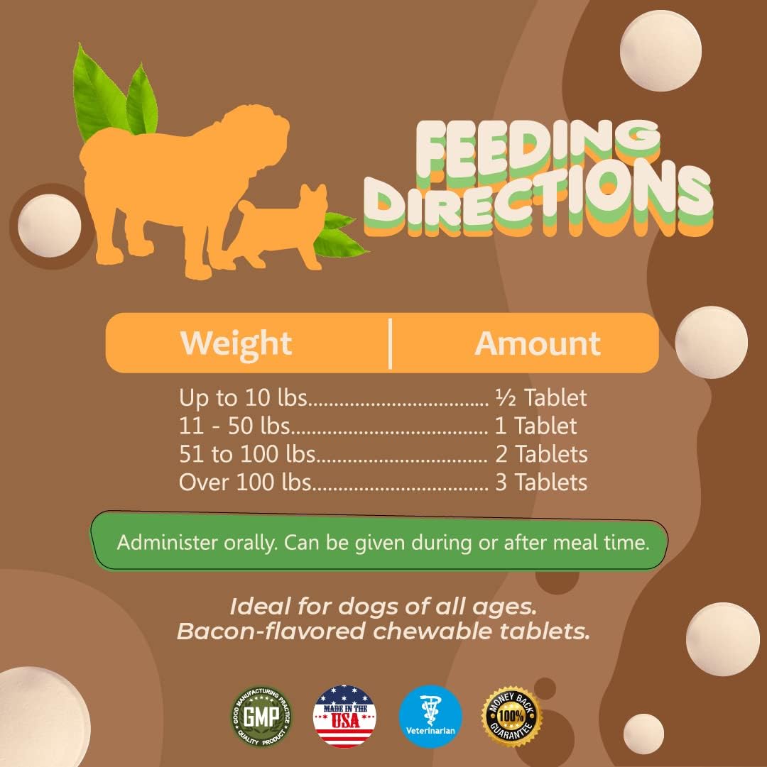 About this item COMPREHENSIVE FORMULA: Contains Omega-3 fatty acids, proteins, minerals, vitamins and amino acids to promote healthy skin and a glossy coat for both dogs and cats EASY DOSING: Bacon-flavored chewable tablets with specific dosing - 1/2 tablet for pets up to 10 lbs, 1 tablet for 10-50 lbs, and 2 tablets for over 50 lbs daily SKIN HEALTH: Targets dry, itchy skin and helps maintain proper skin hydration while supporting natural coat pigmentation and shine SHEDDING CONTROL: Helps minimize normal shedding and promotes healthier coat growth through essential nutrient supplementation QUALITY INGREDIENTS: Contains 250mg of fish oil per tablet, enriched with biotin, vitamin E, and other vital nutrients formulated by veterinarians in USA facilities › See more product details