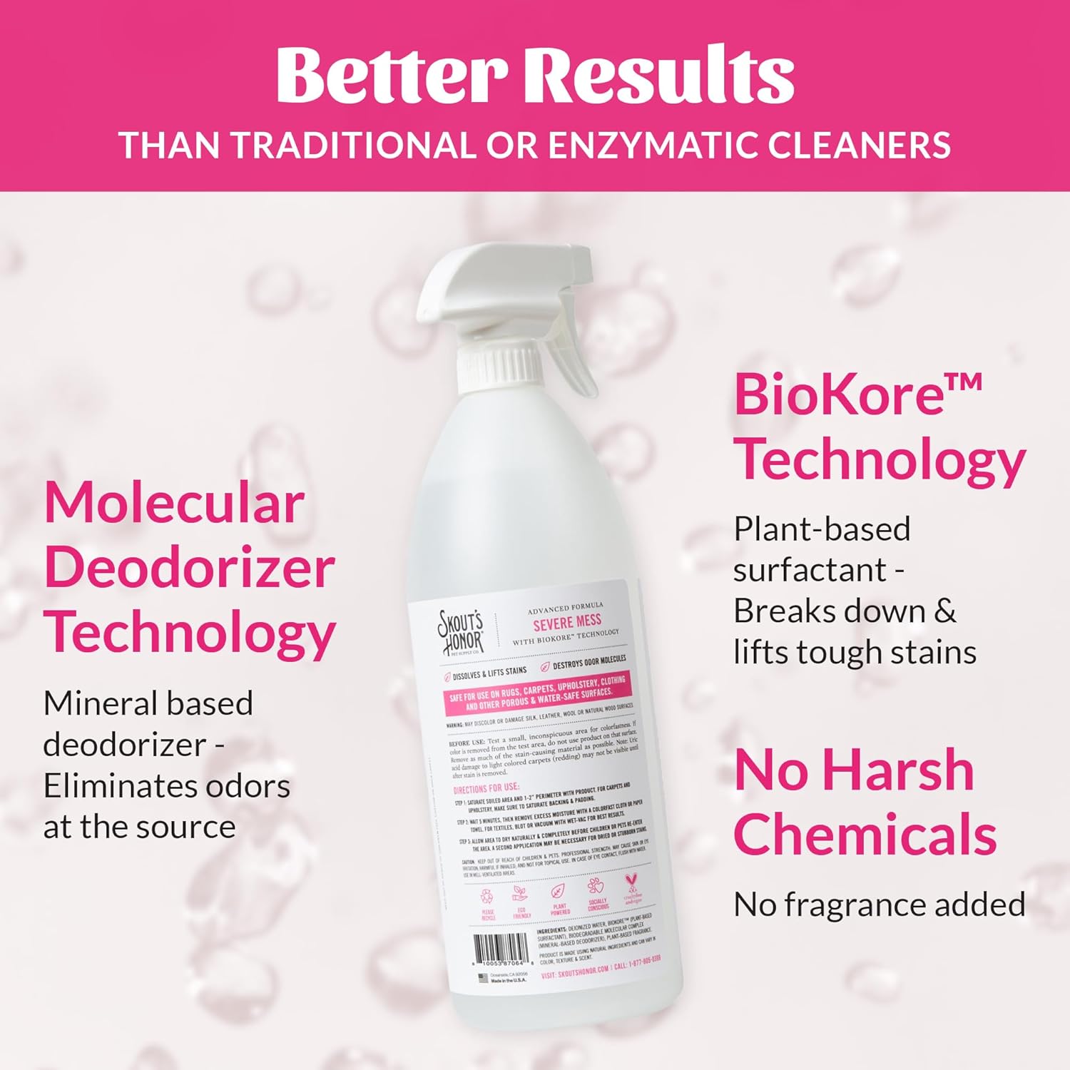 About this item For the Most Severe Cat Messes - Skout's Honor's plant-based formula is designed to dissolve and lift away the toughest pet stains and odors, making it the ultimate cat stain and odor remover. Powerful Molecular Deodorizer- Skout's Honor Severe Mess Stain & Odor Remover targets and eliminates foul odor molecules on contact, ensuring your home stays fresh and clean. Versatile Cleaning Solution - Effectively removes pet stains and odors from carpet, furniture, bedding, and any other water-safe surface, including urine, mud, grease, and even wine! Eco-Friendly & Cruelty Free - Manufactured under the California Green Chemistry Initiative, this Severe Mess Formula is safe for pets, family, and home, and does not contain harsh ingredients or undergo animal testing. Paw Pledge - Together with their customers, Skout's Honor provides a day's worth of food to an animal in need, with every product sold (Buy a Bottle, Feed an Animal). › See more product details