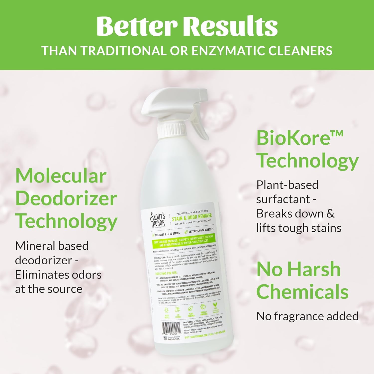 About this item Professional Strength Formula - Skout's Honor pet stain and odor remover uses a plant-based surfactant formula that dissolves and lifts even the toughest stains from any water-safe surface. Powerful Molecular Deodorizer - Targets and eliminates foul odor molecules on contact, ensuring your home smells fresh and clean without masking the odors. Eco-Friendly & Cruelty Free - Manufactured under the California Green Chemistry Initiative, this stain and odor remover is safe for pets, family, and home, and does not contain harsh ingredients or undergo animal testing. Versatile Cleaning Solution - Effectively removes pet stains and odors from carpet, furniture, bedding, and any other water-safe surface, including urine, mud, grease, and even wine! Paw Pledge - Together with their customers, Skout's Honor provides a day's worth of food to an animal in need, with every product sold (Buy a Bottle, Feed an Animal). › See more product details