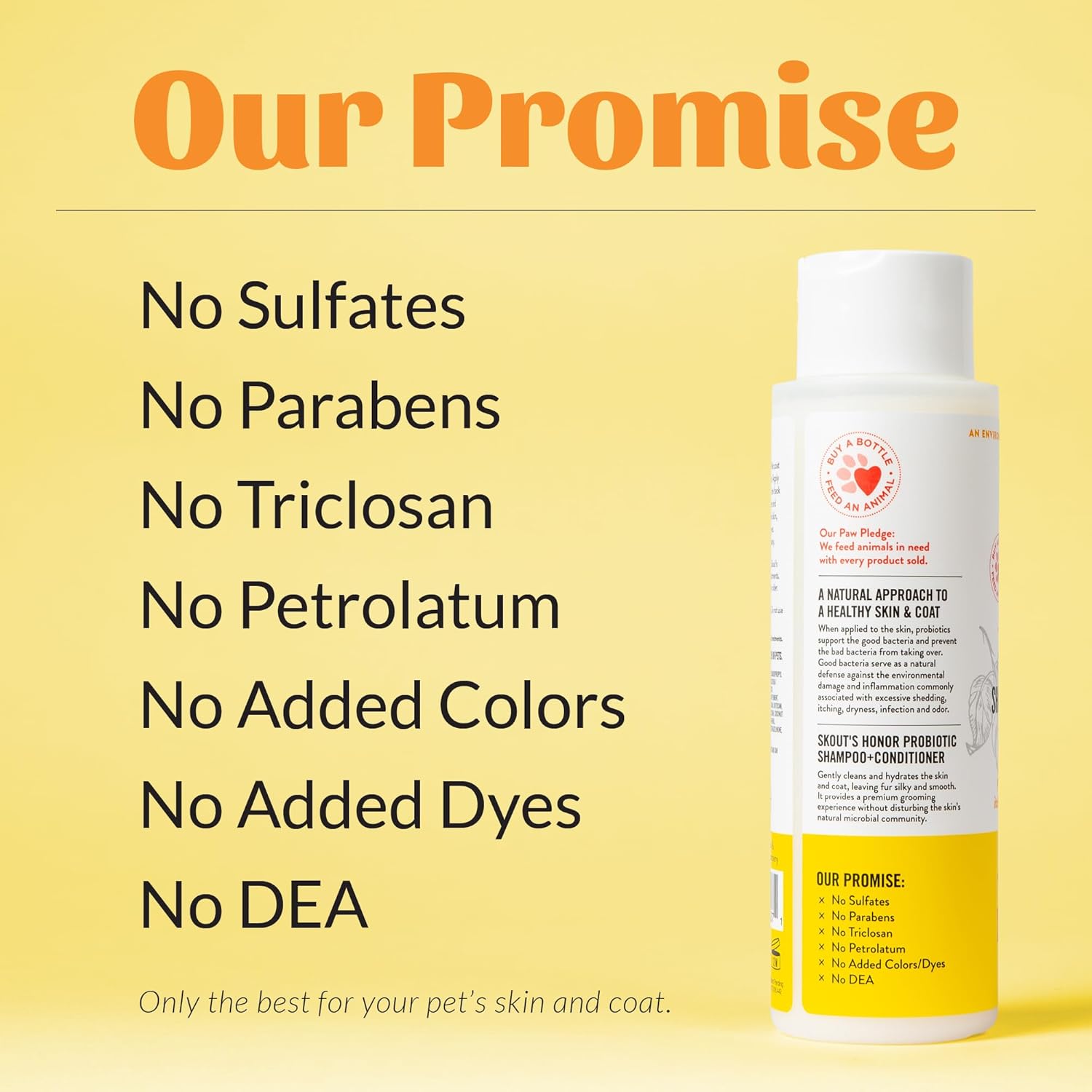 About this item Premium Grooming Experience - Skout's Honor cat shampoo and conditioner gently cleans and hydrates your cat's skin and coat, leaving fur silky and smooth. Probiotic Formula- Each bottle contains topical probiotics that help support a healthy microbiome to defend against common skin problems such as itching, odor, dryness, dandruff, hot spots, and excessive shedding. Natural Ingredients - Formulated with Avocado Oil and Conditioning Omega-3s, this 97% natural shampoo for cats is free from parabens and sulfates. Cruelty-Free - Skout's Honor cat shampoo and conditioner is cruelty-free, ensuring that no animals were used or harmed in the making of this product. Paw Pledge - Together with their customers, Skout's Honor provides a day's worth of food to an animal in need, with every product sold (Buy a Bottle, Feed an Animal). › See more product details