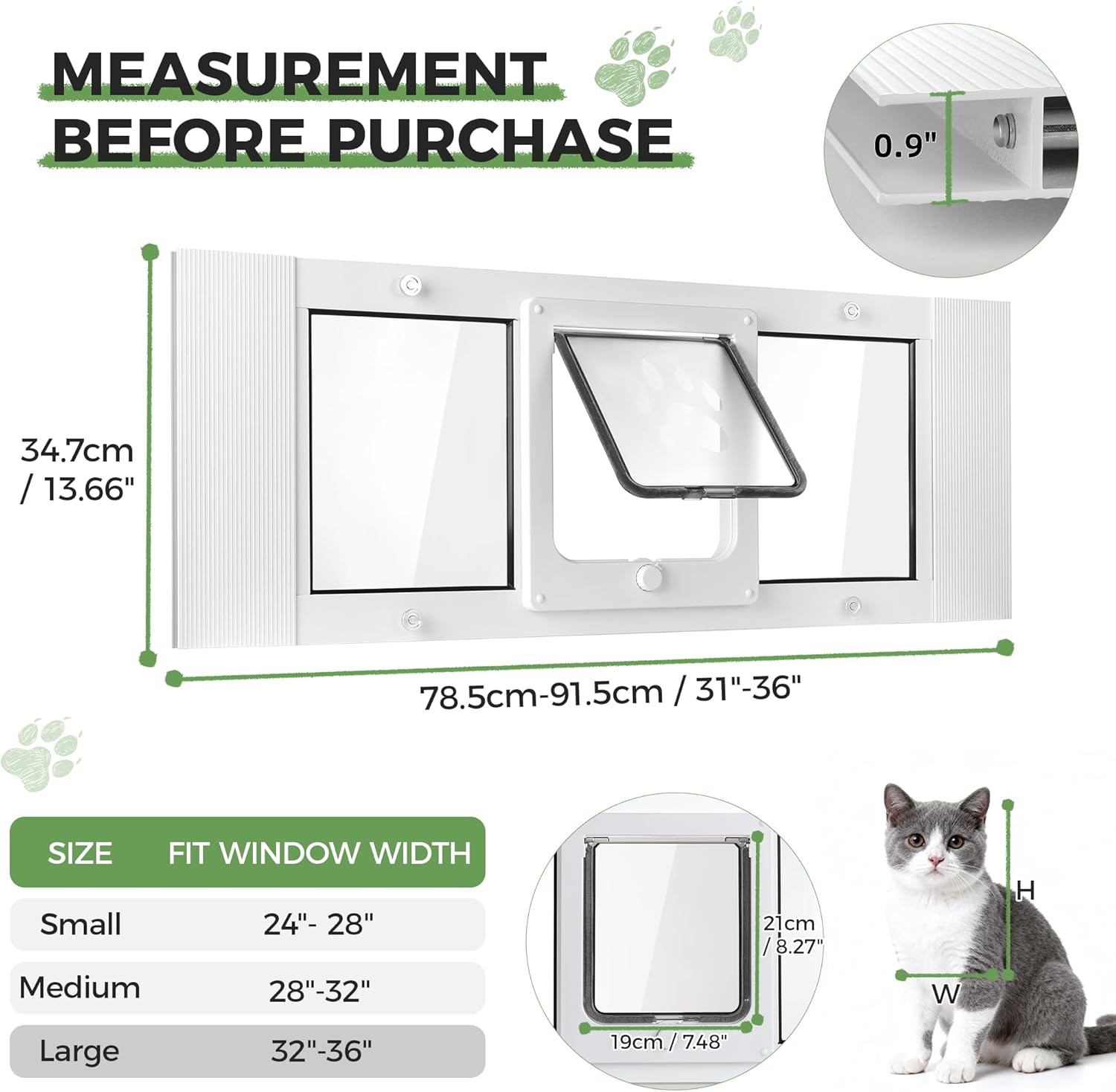 About this item High-Seal Climate Control: Windproof strips + magnetic closure for cat window door block outdoor hot/cold air, maintaining indoor constant temperature while enabling pet free access - saves AC/heating energy for energy-efficient pet door use. 10-Min Quick Installation: Tool-free cat door requires no drills or wall damage, compatible with most standard sliding windows - easy to assemble, reusable for renters or move-in situations (landlord-friendly pet door). Size Versatility: This cat door window insert is available in 3 width sizes and fits most standard sliding windows. Be sure to measure your window width before purchasing. The cat door opening dimensions: 7.5"W x 8.3"H, suitable for most pets. 4 Lock Modes & Multi-Pet Compatible: 4-way lock cat door supports "In Only/Out Only/Both Ways/Locked" settings, meets single/multi-cat needs, frees you from repeated manual operation for pet autonomy. Safety Heavy-Duty Aluminum Frame: Upgraded thickened frame of heavy-duty cat door resists corrosion and scratches, withstands pet impacts, smooth edges prevent pet injuries - safe sliding window pet door. › See more product details