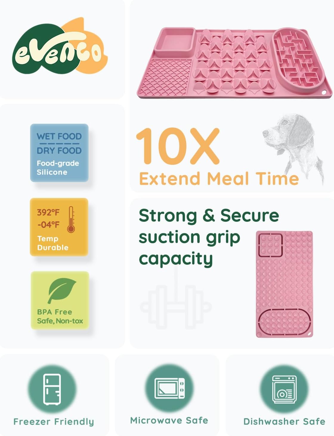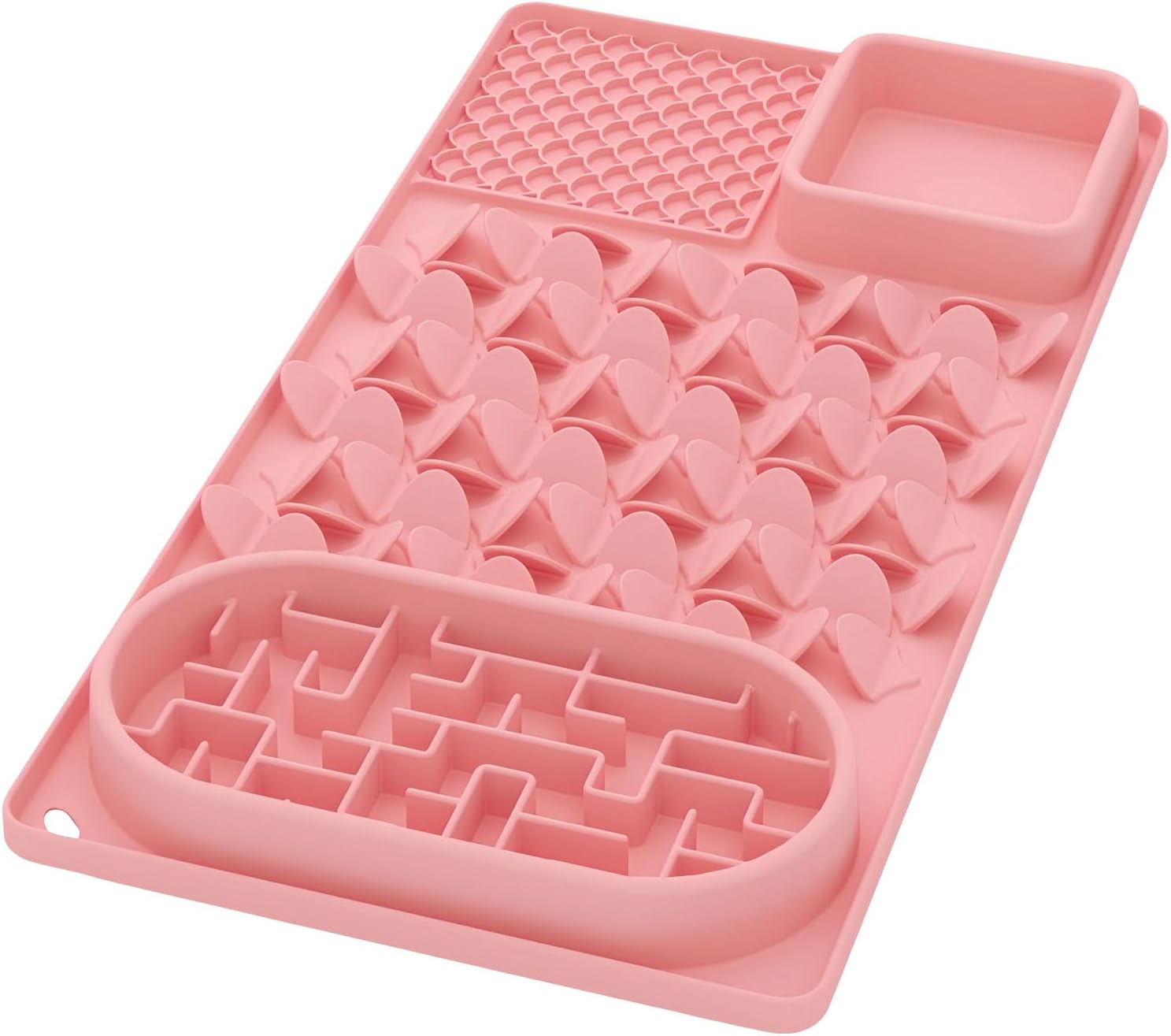 About this item EXTRA LARGE 4-IN-1 FEEDER: Our multifunctional slow dog feeder includes a slow-eating bowl, a dry food bowl, a fish-scale pattern lick mat, and a snuffle area for mental stimulation. Ideal for various types of wet and raw food, providing your pet with a balanced and nutritious diet. SLOW EATING & IMPROVED DIGESTION: This innovative design features a high-density, sturdy snuffle area that effectively hides food, extending mealtime by up to 10X. Slowing down eating reduces bloating and vomiting risk, supporting a healthier, more active lifestyle for your pet. REDUCE ANXIETY & PREVENT DESTRUCTIVE BEHAVIOR: Serves as an excellent distraction tool, this feeder captures your dog's attention, helping them channel their energy and stay entertained. It's perfect for high-energy dogs during bath time, nail trims, or vet visits. Food-Grade Silicone: Made from thick, non-toxic silicone with reinforced suction cups. It stays securely attached even when puppies or large breeds eat enthusiastically. (Friendly reminder: For strong chewers, we recommend supervising mealtime to prevent accidental ingestion.) EASY TO USE & CLEAN: Our dog feeders are designed to be top-rack dishwasher safe, microwave and freezer compatible (avoid heated dry cycle). Save time on cleaning and maintenance so you can spend more quality time with your furry friend! › See more product details