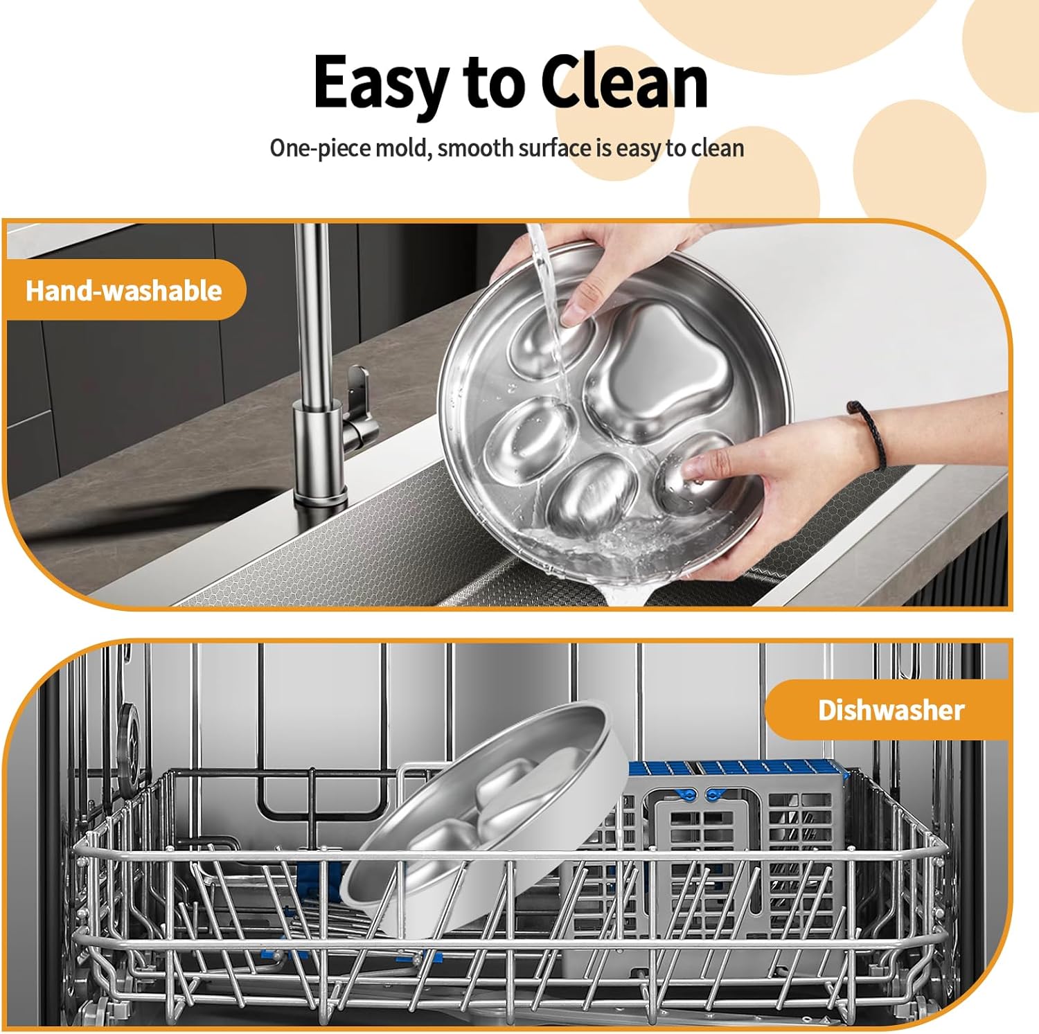 About this item 1.Premium Stainless Steel Slow Feeder Dog Bowl for All Breeds Crafted with durable,food-grade stainless steel,our slow feeder bowl is designed for dogs of all sizes - from small pups to large breeds.The smooth metal surface maintains freshness for both dry and wet food,while resisting odors better than plastic alternatives.Unlike ordinary bowls,this sturdy stainless steel construction won't chip or retain food stains,preserving its sleek appearance through years of daily use.The non-porous material provides a hygienic feeding solution that's easy to wipe clean after every meal. 2.Smart Slow Feeding Design Prevents Choking & Bloat The innovative raised paw pattern maze design forces your fast eater to slow down while eating.Perfect for dogs that gulp their food too quickly,this slow feeder dog bowl helps prevent dangerous conditions like bloat and improves digestion.The strategic obstacles make mealtime last longer while providing mental stimulation. 3.2-in-1 Reversible Design with Non-Slip Silicone Base (8.27"x1.57", 33.8oz) Featuring a unique double-sided design,simply flip the stainless steel slow feeder dog bowl for different difficulty levels.The included heavy-duty silicone sleeve keeps this 33.8oz capacity bowl(measuring 8.27 inches in diameter and 1.57 inches in height)securely in place during use,preventing spills and messes.The non-slip base works great on all floor types for both food and water. 4.Effortless Cleaning & Durable Construction Unlike complicated slow feeder bowls with hard-to-clean crevices,our stainless steel dog bowl features smooth surfaces that wipe clean easily.The one-piece construction is dishwasher safe and won't trap food particles.The rust-proof material maintains its shine through years of daily use and cleaning. 5.Perfect for Puppies to Large Breed Dogs Whether you have a small puppy or a large breed dog,this slow feeder bowl accommodates all sizes.The food-grade stainless steel is gentle on sensitive noses.The medium-depth design prevents messy spills while allowing easy access to every last bite of food. › See more product details