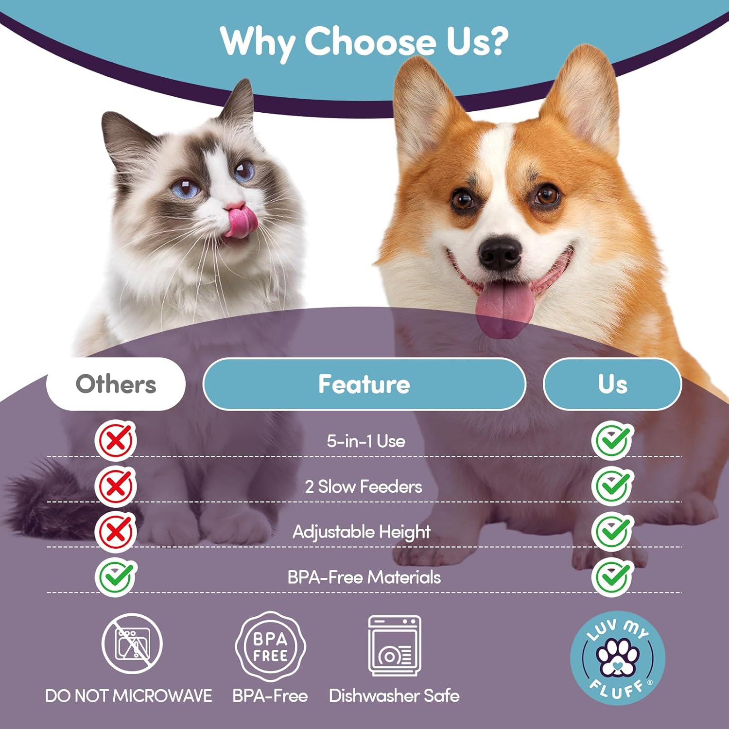 - Special Feature: 5-in-1 multifunctional design, Adjustable height (3.94", 4.33", 5.12"), Burger-style stackable set, Travel friendly & portable, Two slow feeders + double-sided lick matSee more