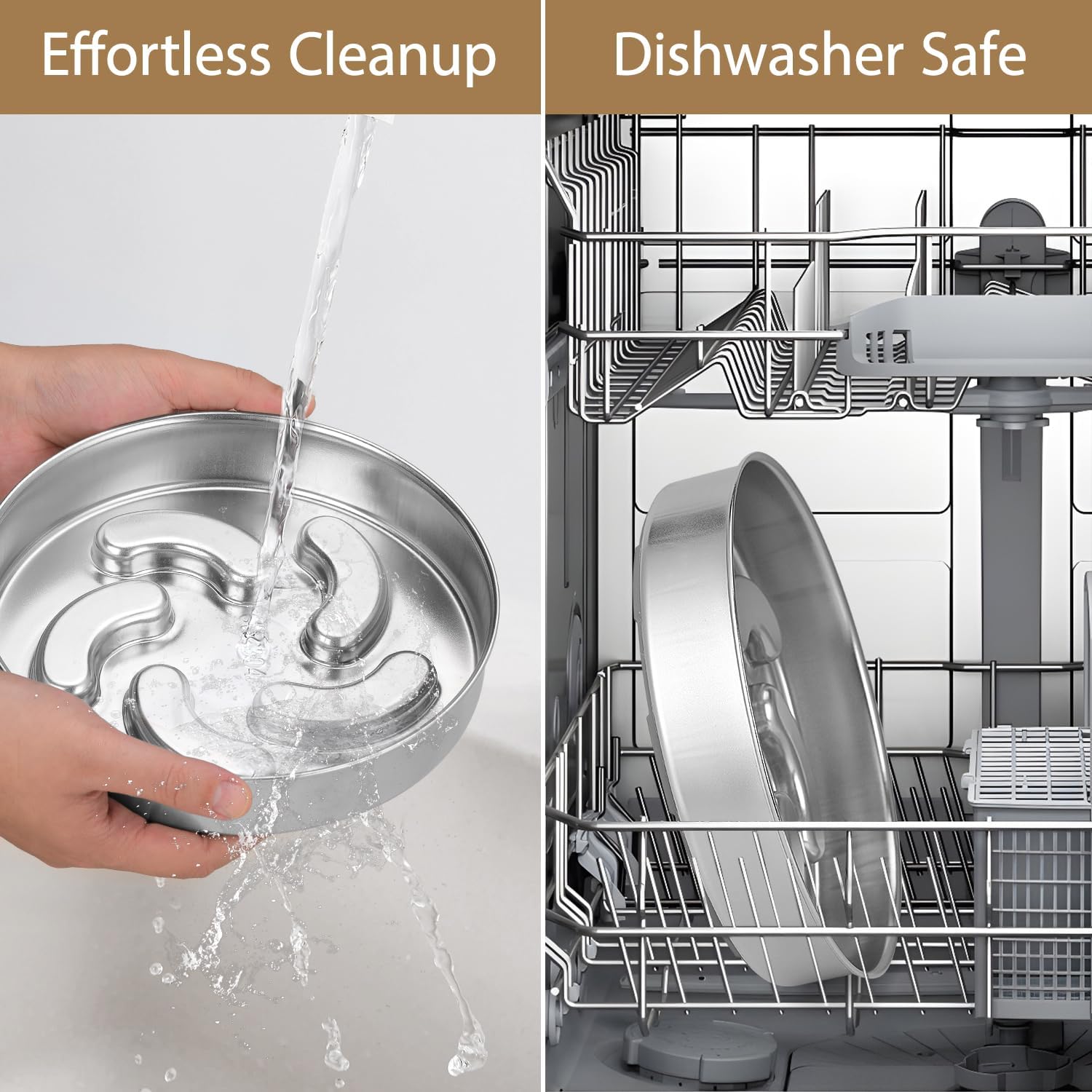 About this item Slow Down Eating: The unique design that adds an element of challenge to mealtime, effectively prolonging your pet's eating. This can significantly reduce the risk of choking, gagging, and digestive problems such as bloating and indigestion. High-Quality Stainless Steel Material: Made with food-grade stainless steel, which makes the dog bowls sturdy, long-lasting, odor-free, and built to last. It is dishwasher safe for quick and easy cleaning. Non-Slip Base: It has a non-slip base that effectively prevents your furry friend from sliding or overturning the bowl while eating, protecting your floors from scratches, spills, and messes. Functional and Health-Conscious: Engineered specifically for pets that eat too rapidly, it promotes healthier eating habits. The unique flower- hump design isn’t just for fun; it’s a practical way to encourage slower eating patterns, which can improve digestion and nutrient absorption. Large Capacity: Measuring 8.7*8.7*1.6 IN'', making it perfect for small, medium, and large breed dogs. › See more product details