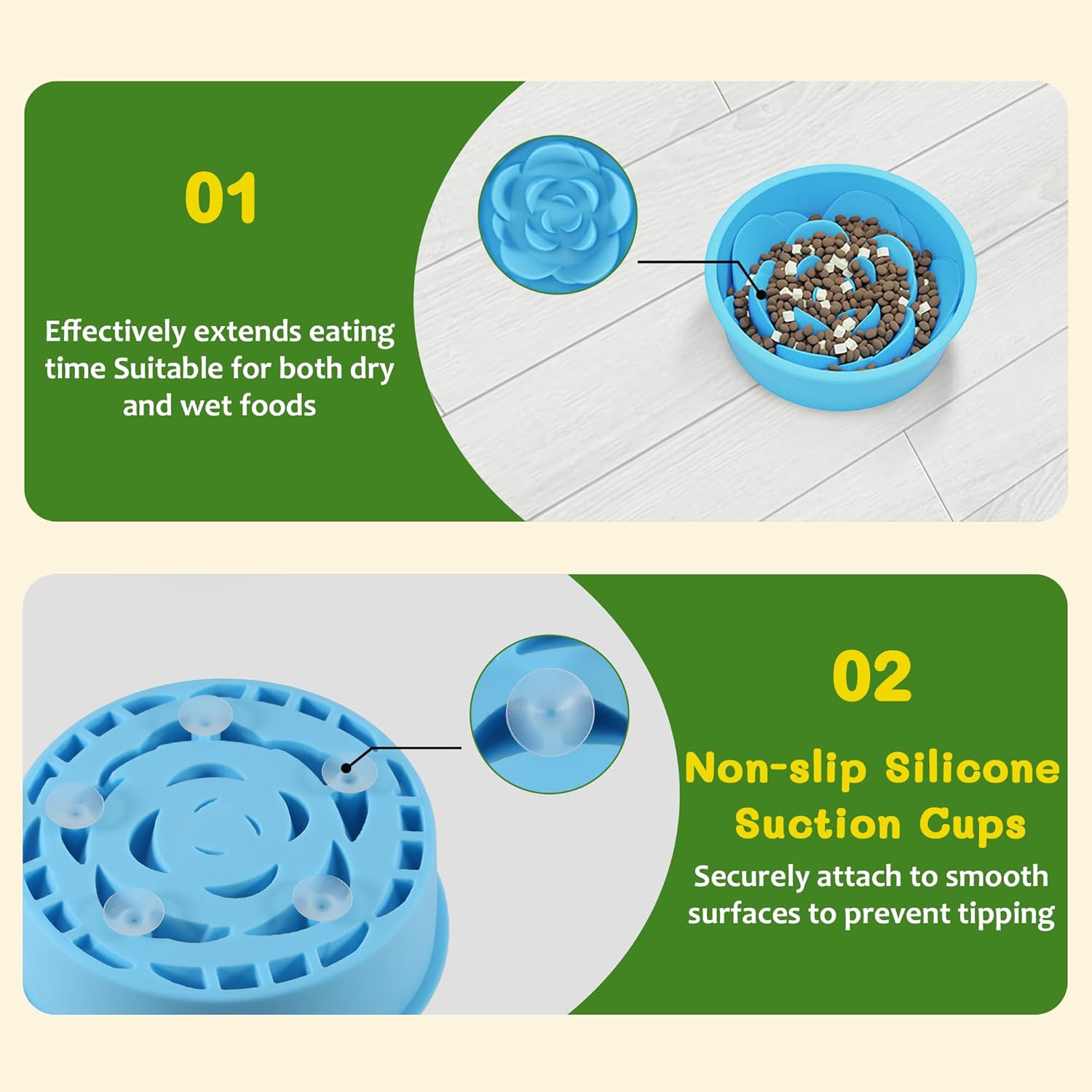 About this item Slows Eating & Prevents Choking: Unique rose-petal barriers force dogs to eat slowly, reducing gagging risks and improving digestion Pet-Safe Silicone Material: Made of non-toxic, food-grade silicone free of BPA/phthalates for worry-free mealtimes Strong Suction Base Stays Put: Built-in suction cups firmly adhere to floors/tiles, stopping bowl flips by energetic eaters Easy Clean & Durable Design: Dishwasher-safe construction resists stains and odors; flexible petals withstand chewing Universal Dog Bowl Solution: Ideal for both kibble and wet food; 30 oz capacity fits puppies to large breeds › See more product details