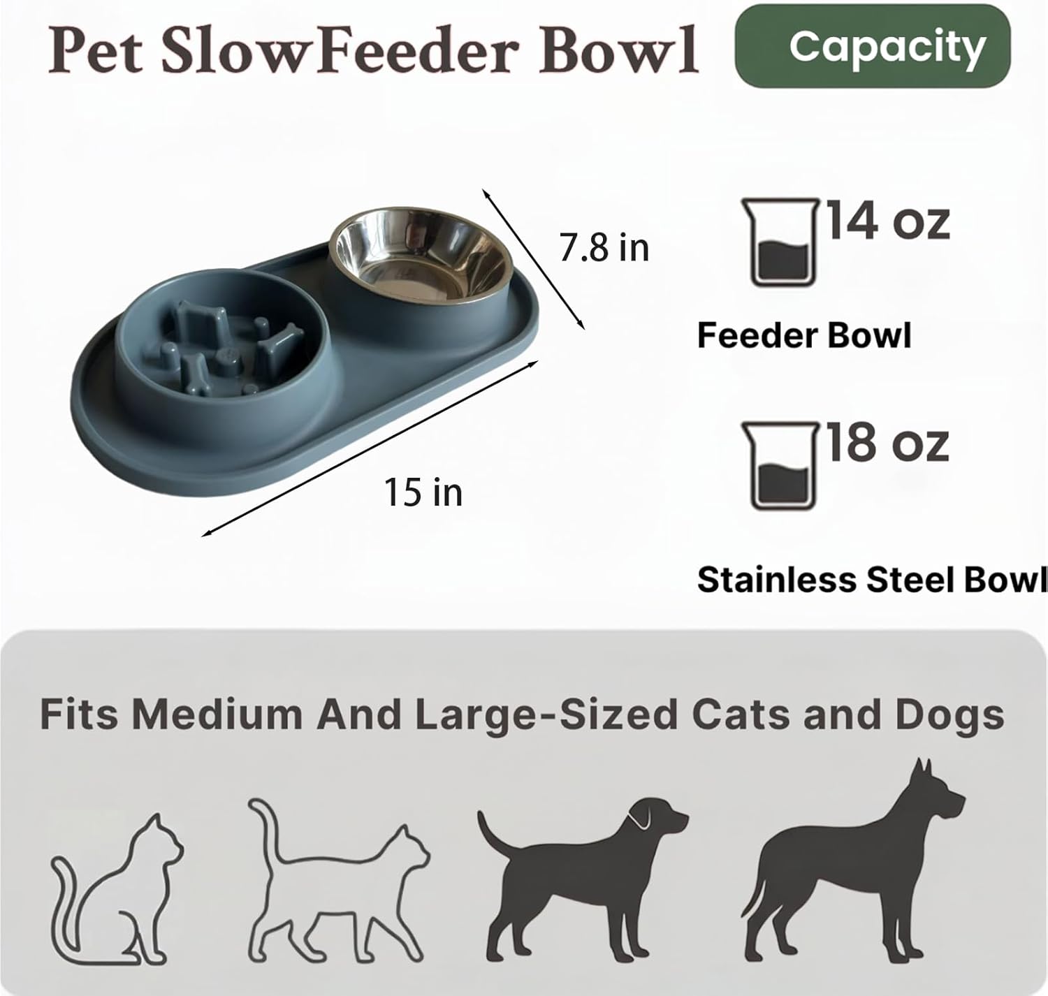 Curb fast eating (and reduce vomiting/bloat) with our interactive slow feeder: bone-shaped obstacles turn meals into a paced, mentally stimulating game. Made from food-grade, chew-resistant material for safe, durable use. Non-slip base + built-in mat keeps spills contained. Includes a stainless steel bowl (for water/canned food)—ideal for dry/wet treats, multi-pet homes, or versatile feeding. Upgrade to healthier, cleaner mealtimes.