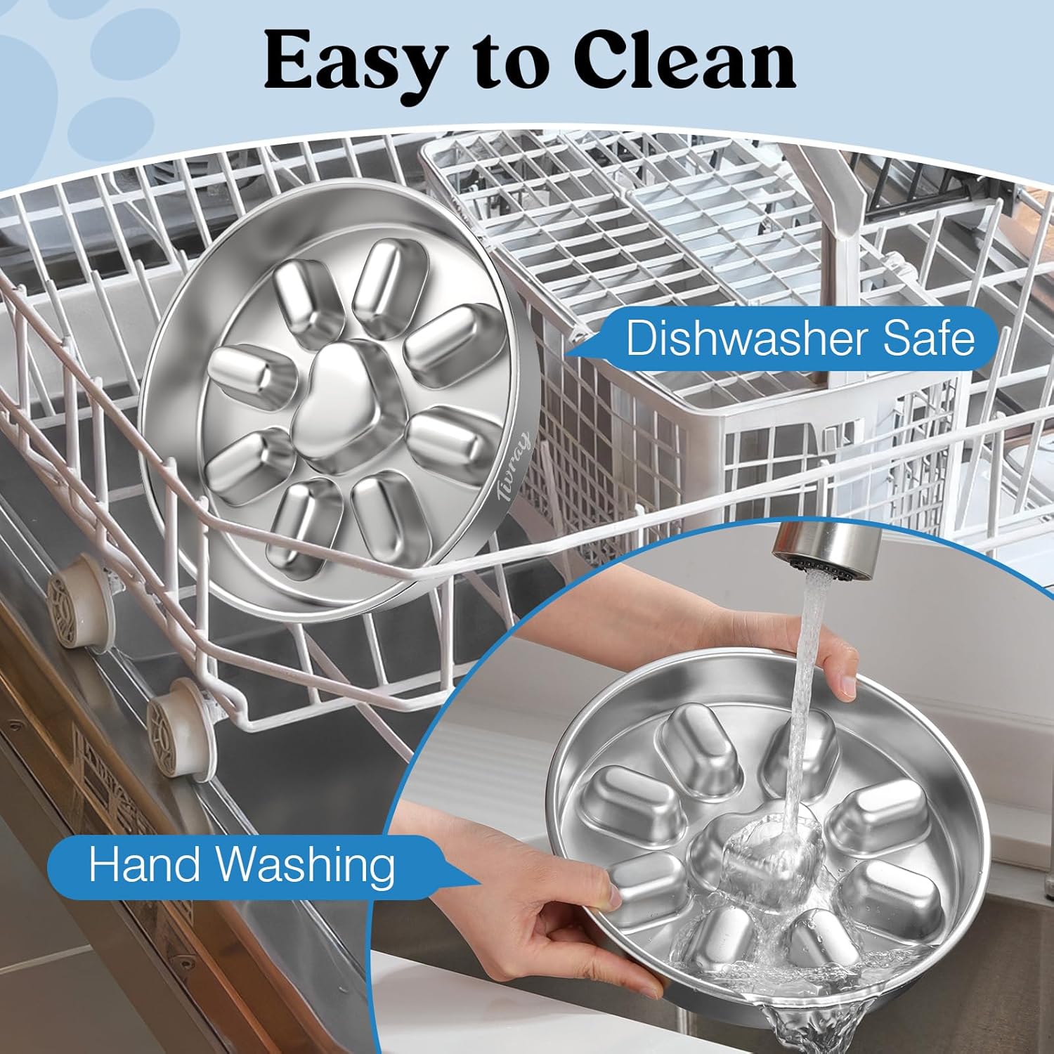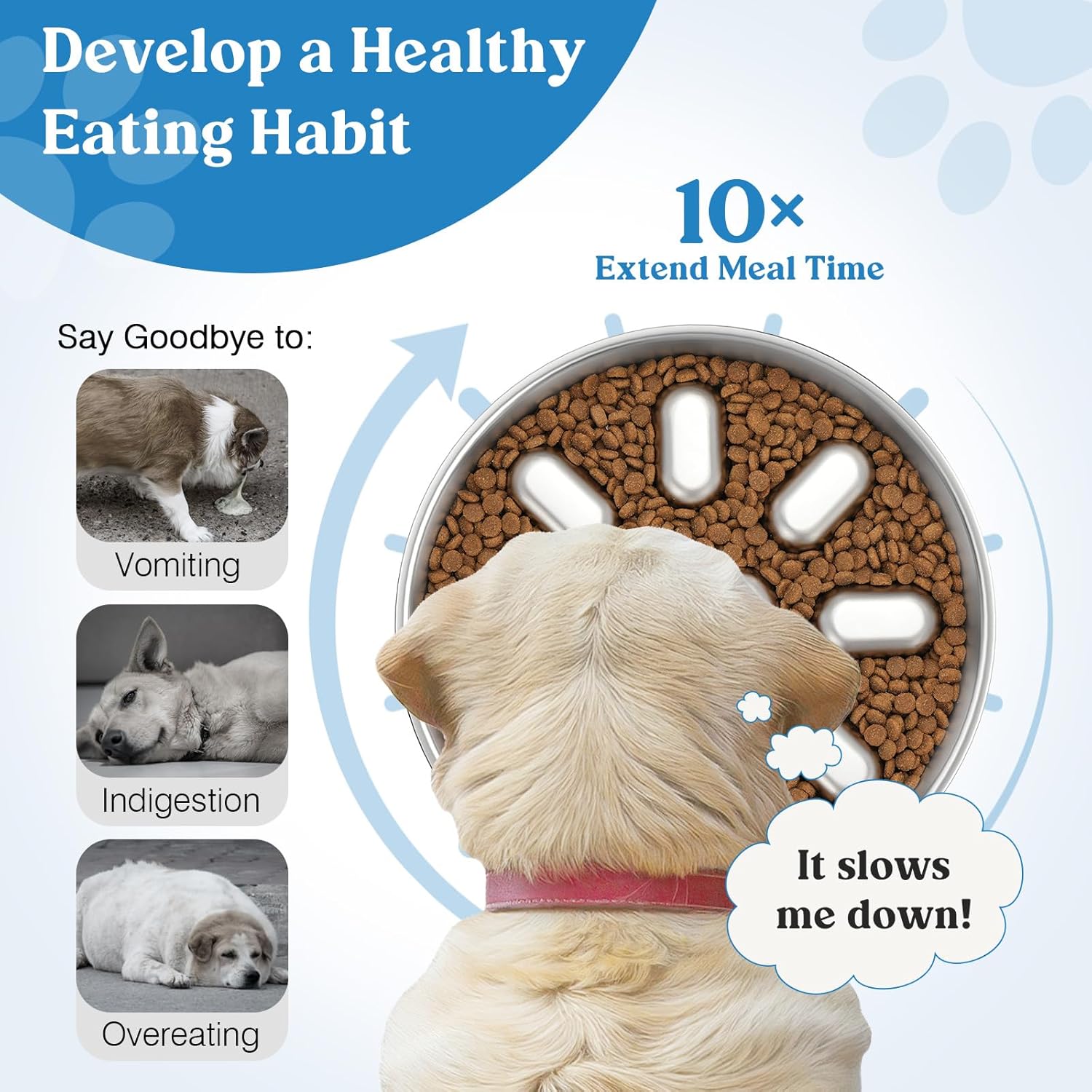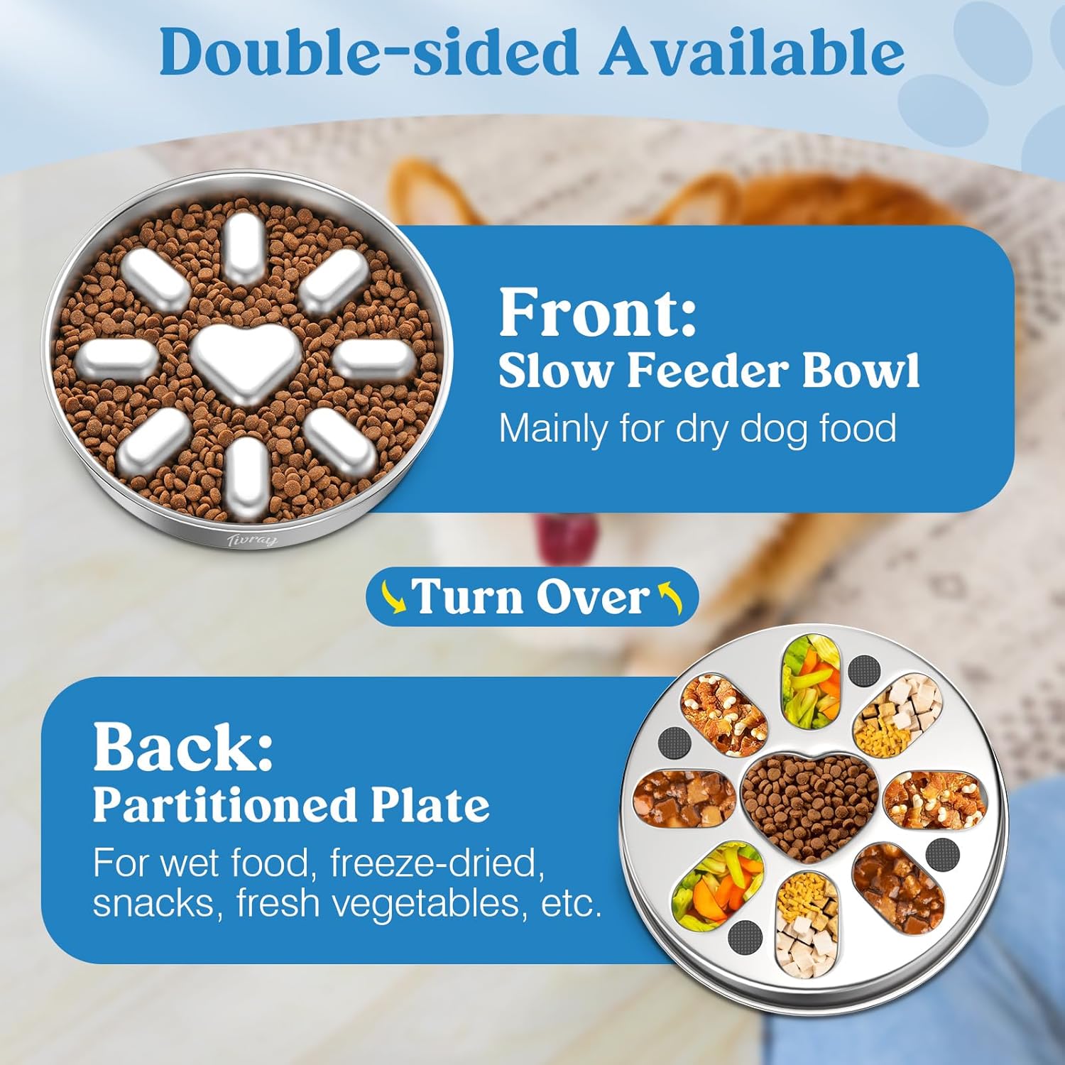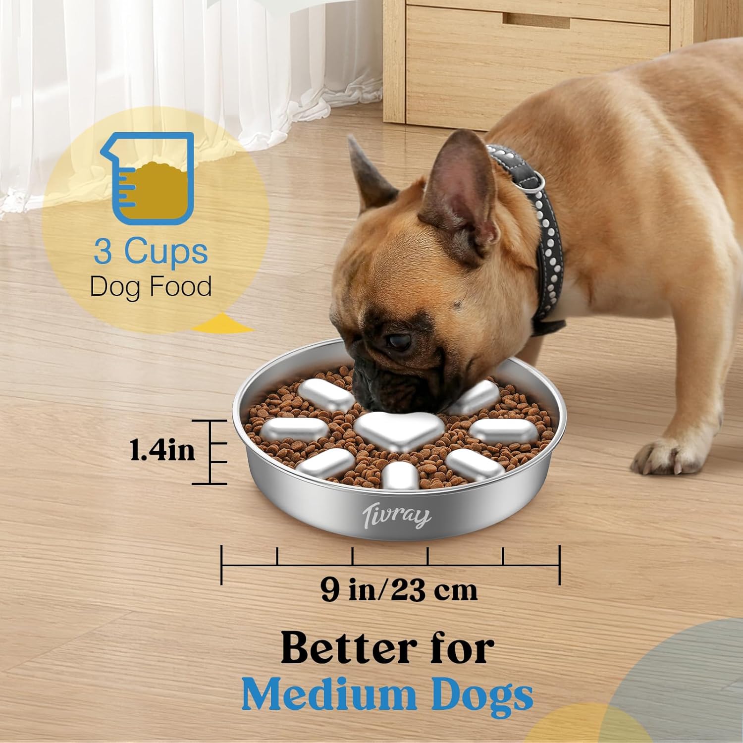 About this item Slow Down Dog's Eating: Tivray slow feeder dog bowls are designed with raised heart and oval patterns inside to slow down your dog's eating and prevent them from the risk of bloating, vomiting, and choking due to eating too fast. It promotes digestion and allows dogs to develop a good eating habit. Safe 304 Stainless Steel: Made of food-grade stainless steel, the metal dog slow feeder bowl has a smooth surface without hurting your dog's mouth and does not rust, ensuring a safe eating experience for your beloved dog. Dog bowls are sturdy enough to withstand impact and can be used for a long time without breaking. Large Capacity and Dual-Sided Use: The reverse side of the slow eating dog bowl can be used as a pet food partitioned dinner plate. Both sides support to put dry dog food, nutritious runny food, snacks, etc., and you can DIY your little one's food freely. Large size (Diameter: 9.1'', Height: 1.4'') can hold about 354g/ 3 cups of dog food, and it is recommended to hold 185g/ 1.5 cup for the best slow food effect. Non-slip Base: The dog bowl slow feeder with 8 non-slip mats mounted to the bottom prevents sliding or tipping, provides excellent stability and minimizes noise while your dog is eating. It also protects your floor from scratches. Easy to Clean: Stainless steel dog bowls have a smooth surface for effortless cleaning and maintenance. It can be cleaned by rinsing, hand or dishwasher without leaving any unpleasant smell or food residue. › See more product details