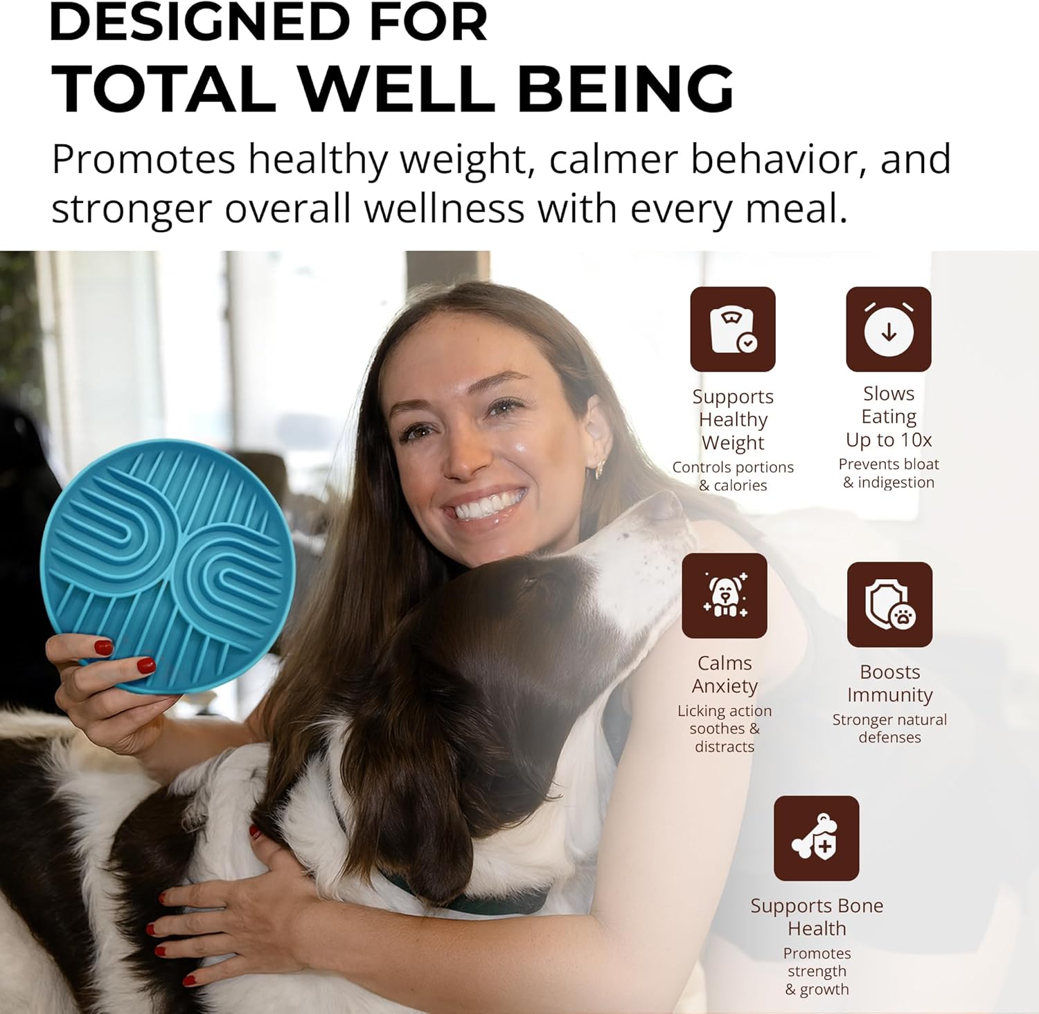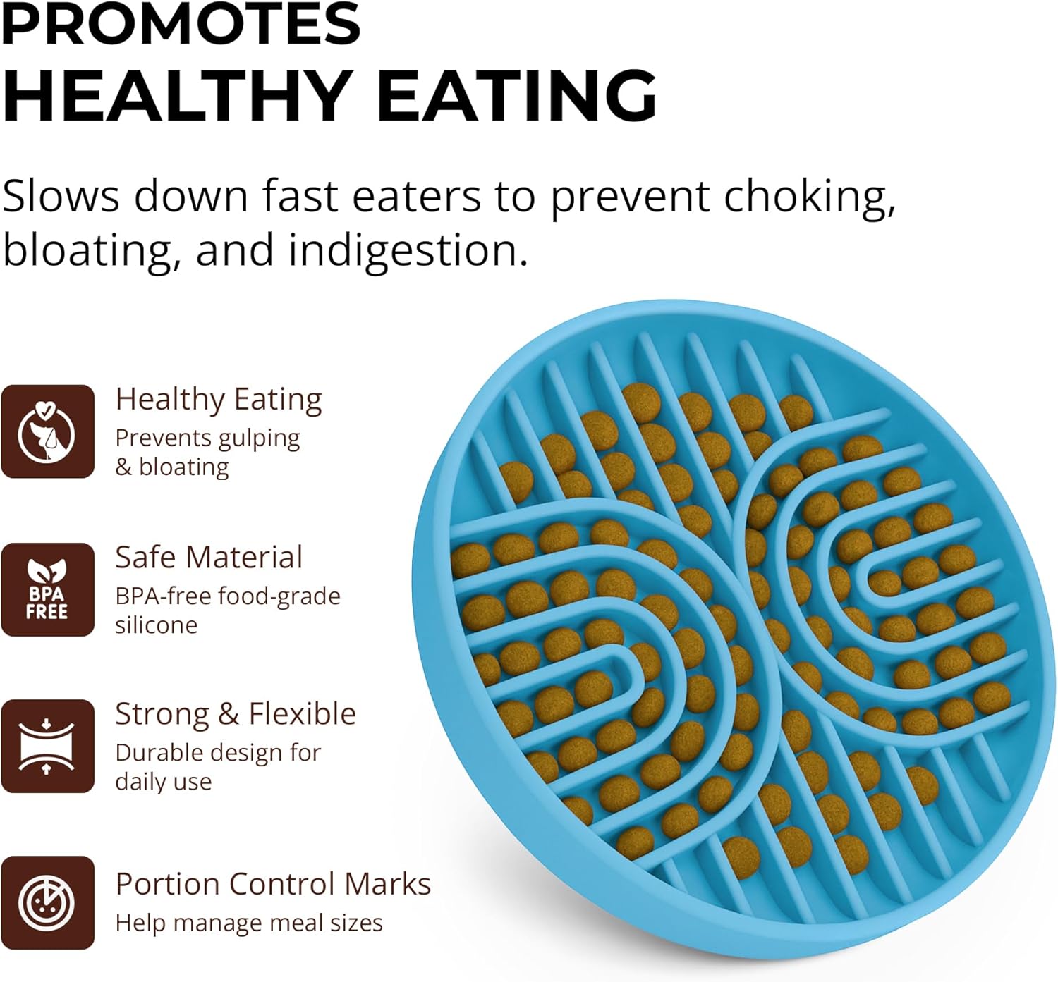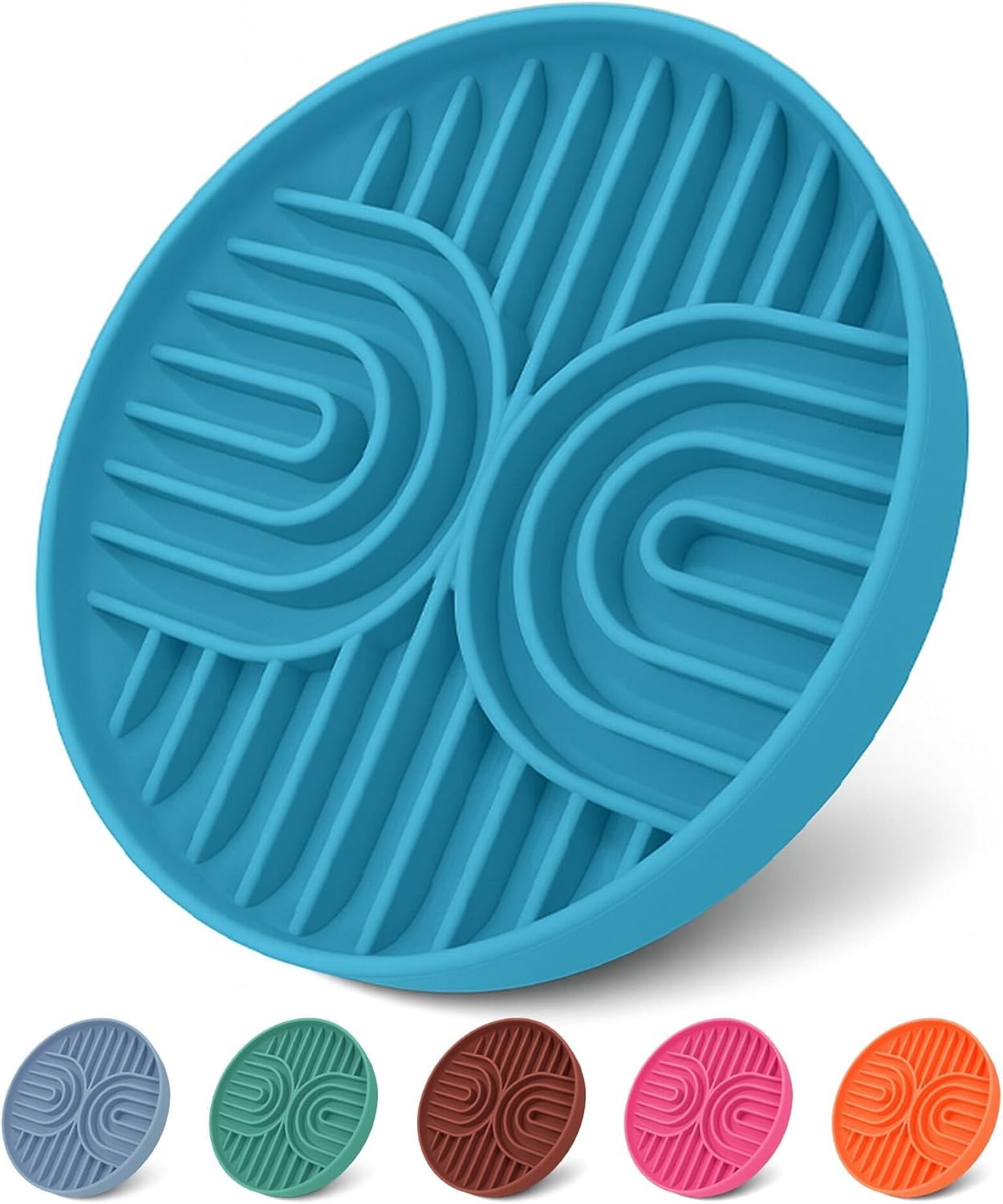 About this item SLOW FEEDING DESIGN - Features innovative maze-like design that naturally slow down your dog's eating pace, preventing gulping and promoting healthier digestion. This puzzle feeder dog bowl helps reduce bloating, regurgitation, and obesity in dogs of all sizes. DURABLE FOOD-GRADE CONSTRUCTION - Crafted from high-quality silicone that's completely food-safe. This dog slow feeder bowl withstands daily use and repeated washing while maintaining its shape and effectiveness for years of reliable service. NON-SLIP STABILITY BASE - Equipped with a secure non-slip bottom that keeps the bowl firmly in place during feeding time. This dog food bowl prevents sliding and spills, making mealtime mess-free for active puppies and dogs on any surface type. DISHWASHER-SAFE CLEANING - Designed for hassle-free maintenance with complete dishwasher compatibility. The smooth silicone surface prevents food buildup, ensuring your slow feeder dog bowl stays hygienic and ready for every meal. IDEAL FOR SMALL TO MEDIUM-SIZED PETS - Suitable for both medium and small slow feeder bowl needs, this design accommodates up to 2 cups of food. Ideal for puppies, dogs, and even cats. It works with canned food, raw diet or liquids. A multifunctional dog puzzle feeder bowl that helps every pet eat at a healthier pace. › See more product details