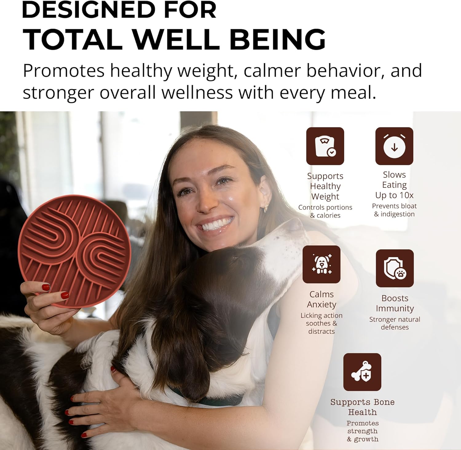 About this item SLOW FEEDING DESIGN - Features innovative maze-like design that naturally slow down your dog's eating pace, preventing gulping and promoting healthier digestion. This puzzle feeder dog bowl helps reduce bloating, regurgitation, and obesity in dogs of all sizes. DURABLE FOOD-GRADE CONSTRUCTION - Crafted from high-quality silicone that's completely food-safe. This dog slow feeder bowl withstands daily use and repeated washing while maintaining its shape and effectiveness for years of reliable service. NON-SLIP STABILITY BASE - Equipped with a secure non-slip bottom that keeps the bowl firmly in place during feeding time. This dog food bowl prevents sliding and spills, making mealtime mess-free for active puppies and dogs on any surface type. DISHWASHER-SAFE CLEANING - Designed for hassle-free maintenance with complete dishwasher compatibility. The smooth silicone surface prevents food buildup, ensuring your slow feeder dog bowl stays hygienic and ready for every meal. IDEAL FOR SMALL TO MEDIUM-SIZED PETS - Suitable for both medium and small slow feeder bowl needs, this design accommodates up to 2 cups of food. Ideal for puppies, dogs, and even cats. It works with canned food, raw diet or liquids. A multifunctional dog puzzle feeder bowl that helps every pet eat at a healthier pace. › See more product details
